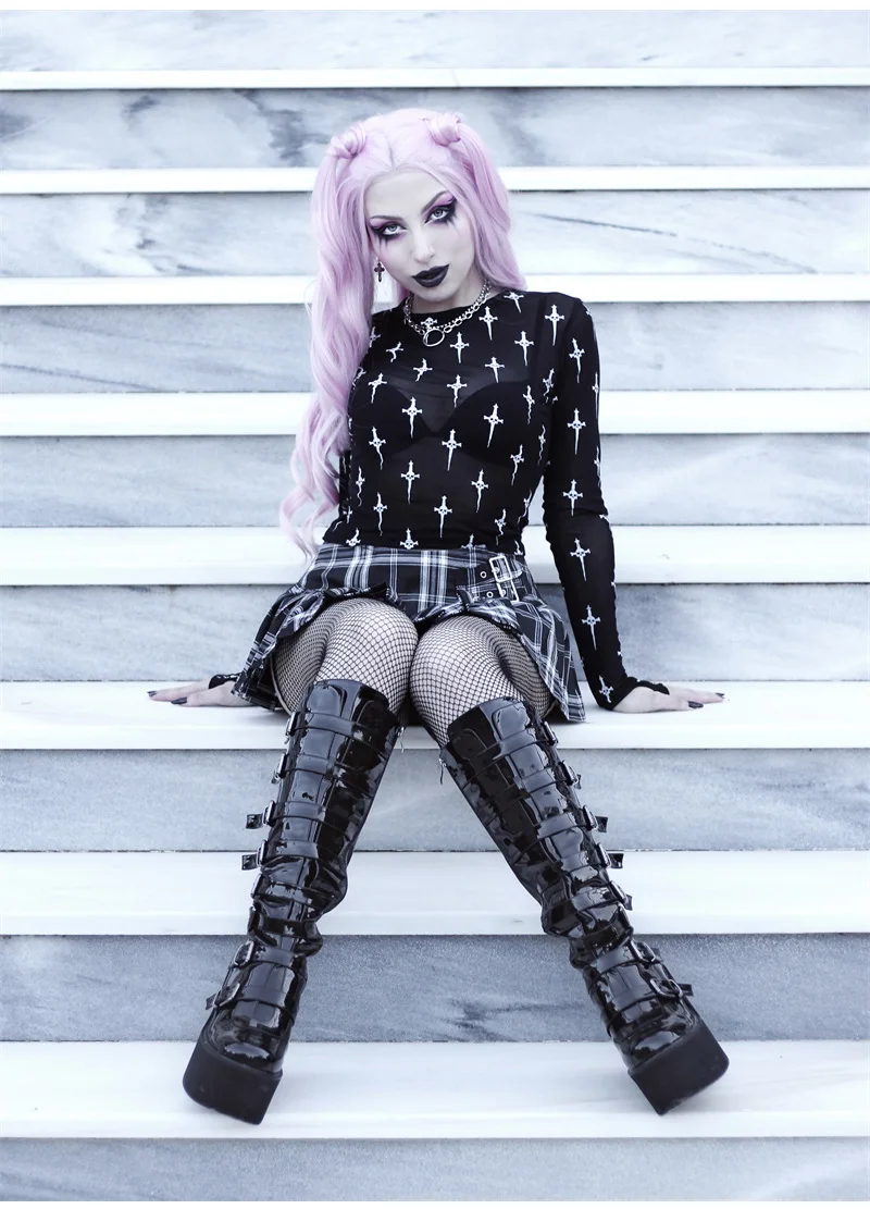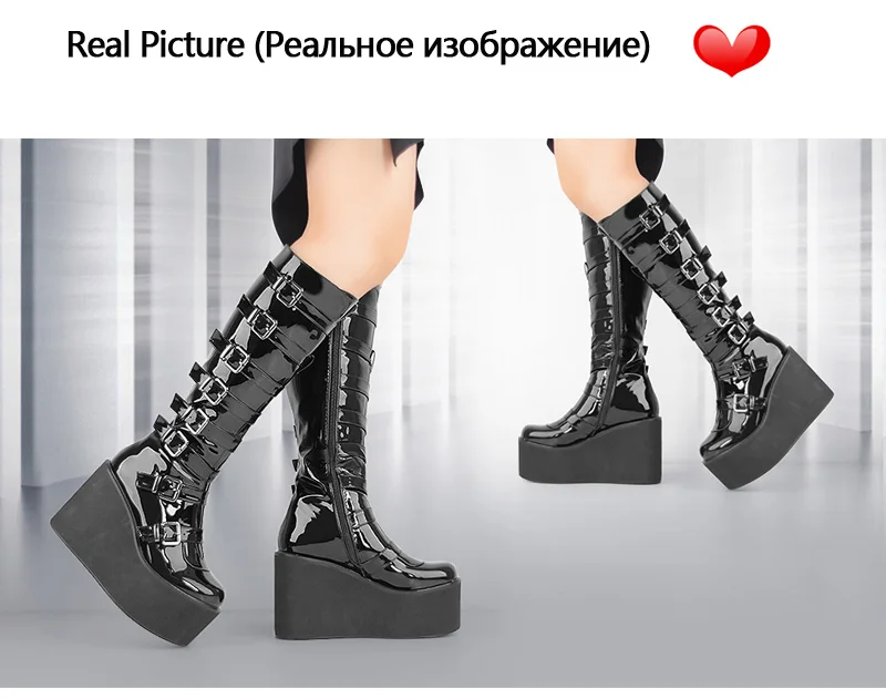 Botas altas hasta la rodilla con plataforma para mujer, punta redonda, charol negro, cuñas, tacones, cremallera lateral, botas altas hasta la rodilla, talla grande, estilo punk