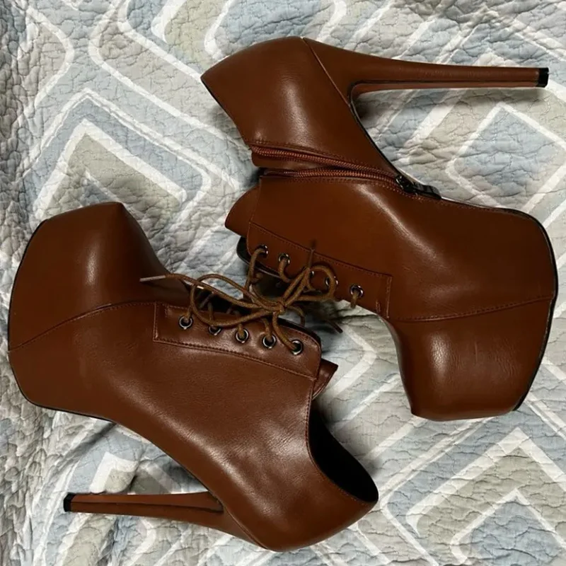 Botines de plataforma con cordones y tacón alto de color chocolate para mujer, botines de tacón de aguja con cremallera lateral y talla grande, a la moda.