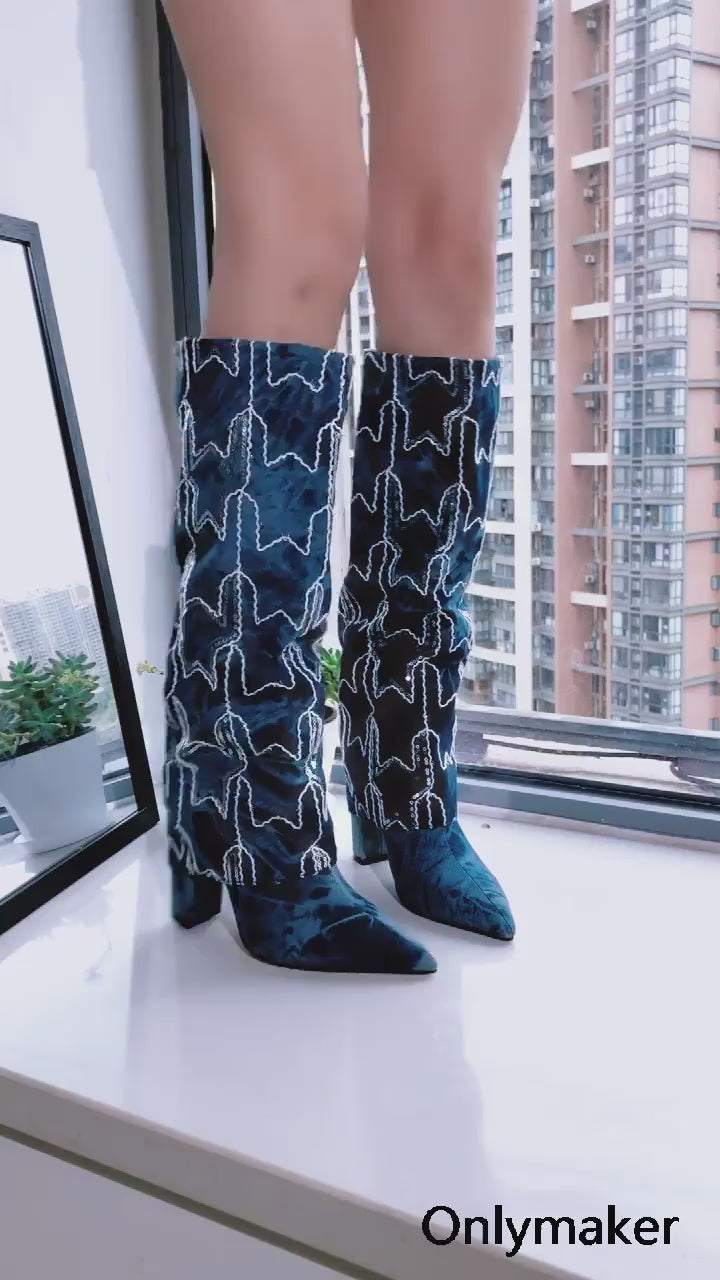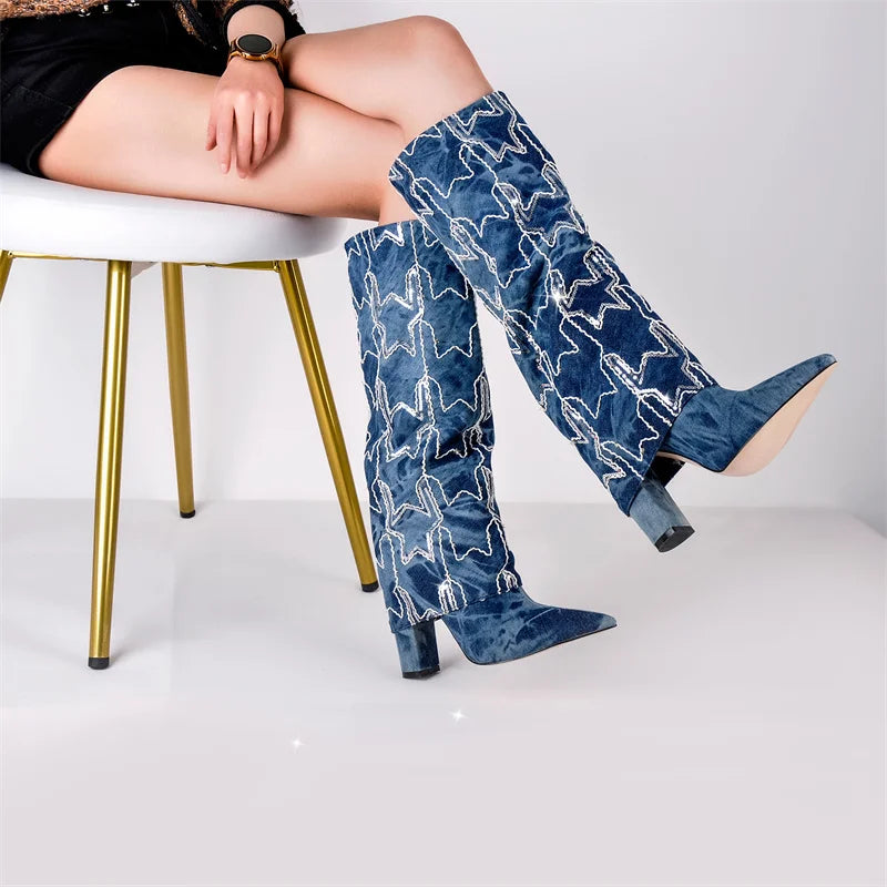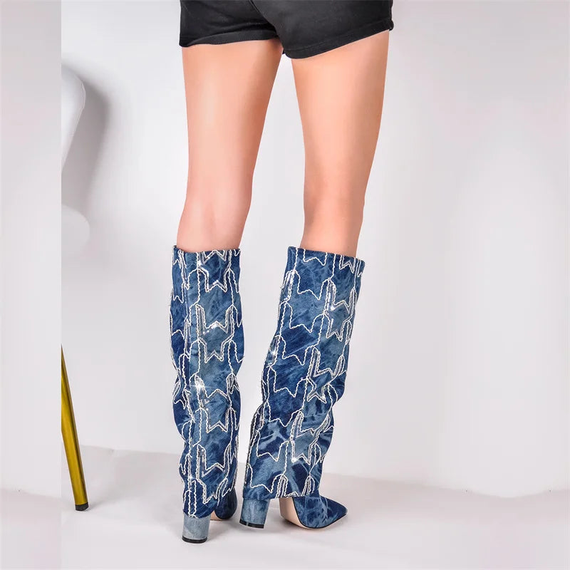 Botas vaqueras de punta puntiaguda para mujer, hasta la rodilla, plegables, con bordado de estrellas, con tacón alto grueso y bloque.