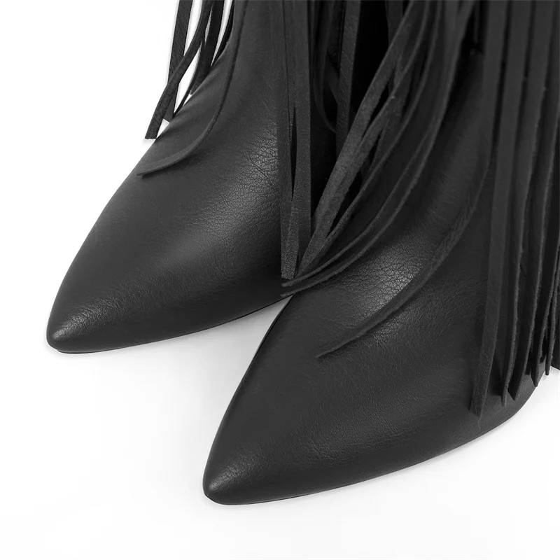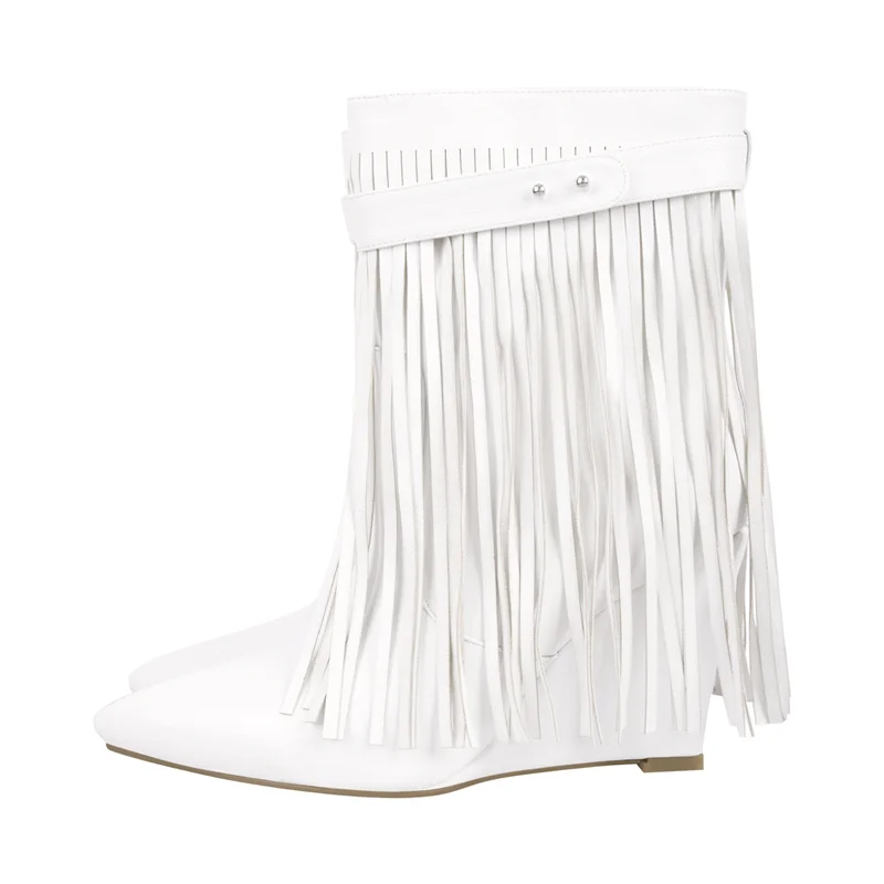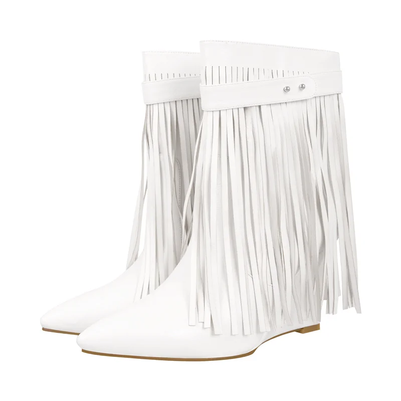 Botas de mujer con punta puntiaguda, flecos y tacón de cuña mate, moda de invierno, talla grande, botas modernas hechas a mano para invierno.
