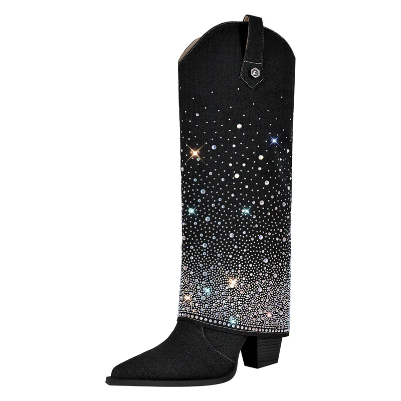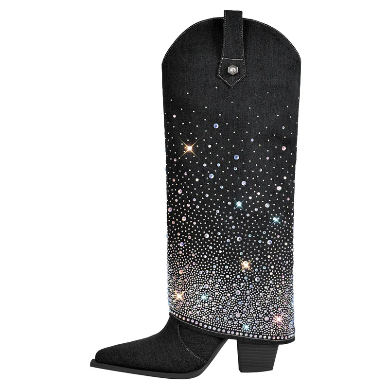 Botas altas hasta la rodilla con punta puntiaguda para mujer, plegables, con tacón grueso y tacón alto, con pedrería