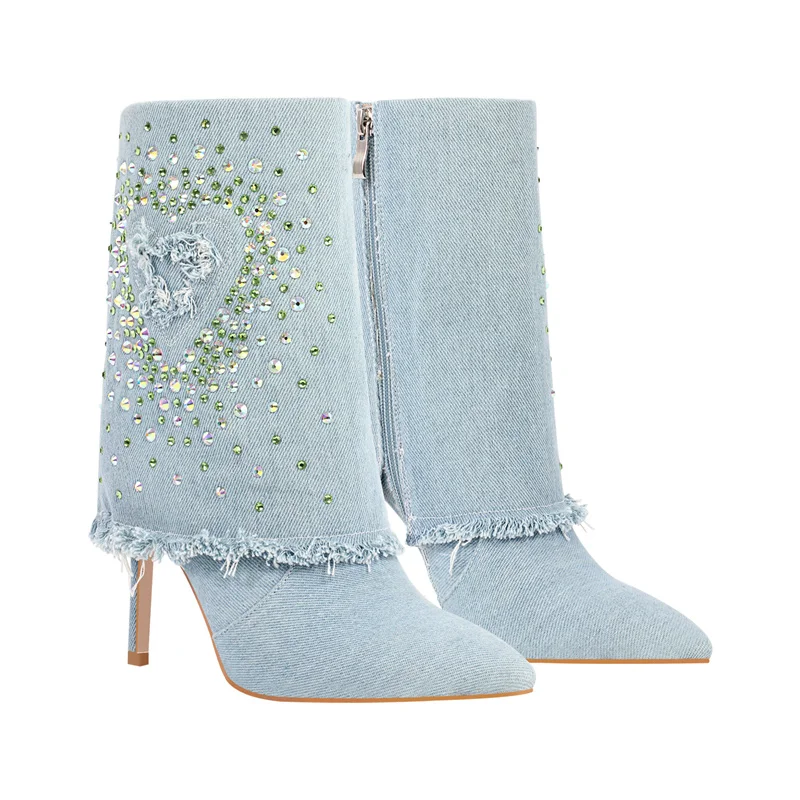 Botas de mezclilla con punta puntiaguda y tacones finos con pedrería para mujer