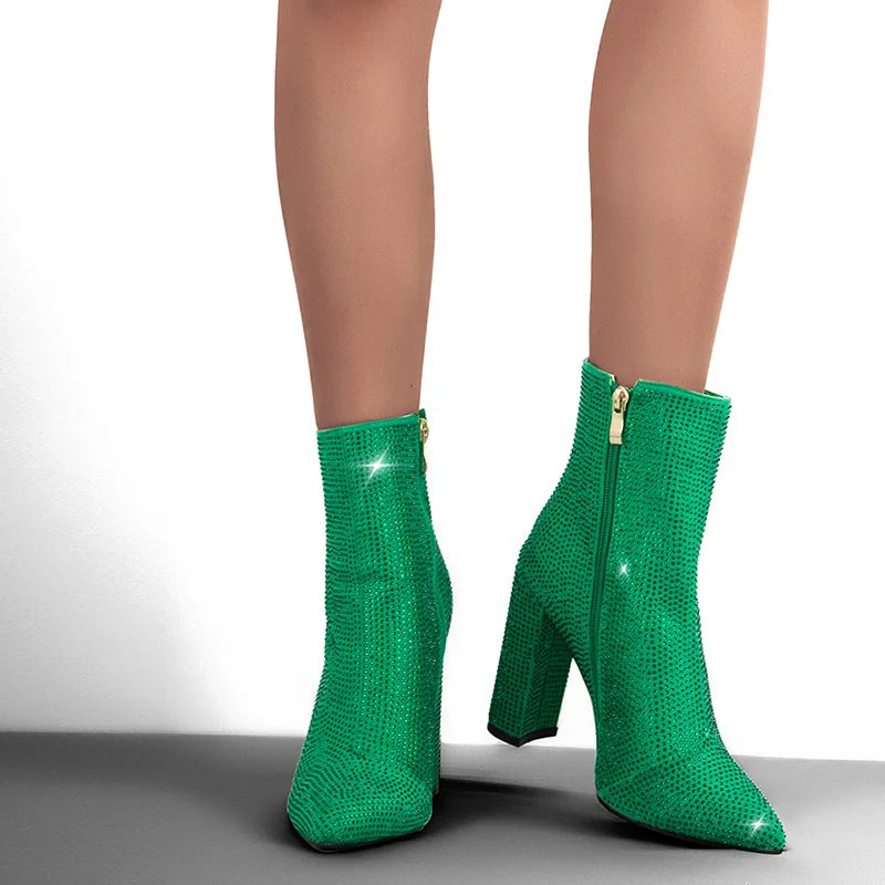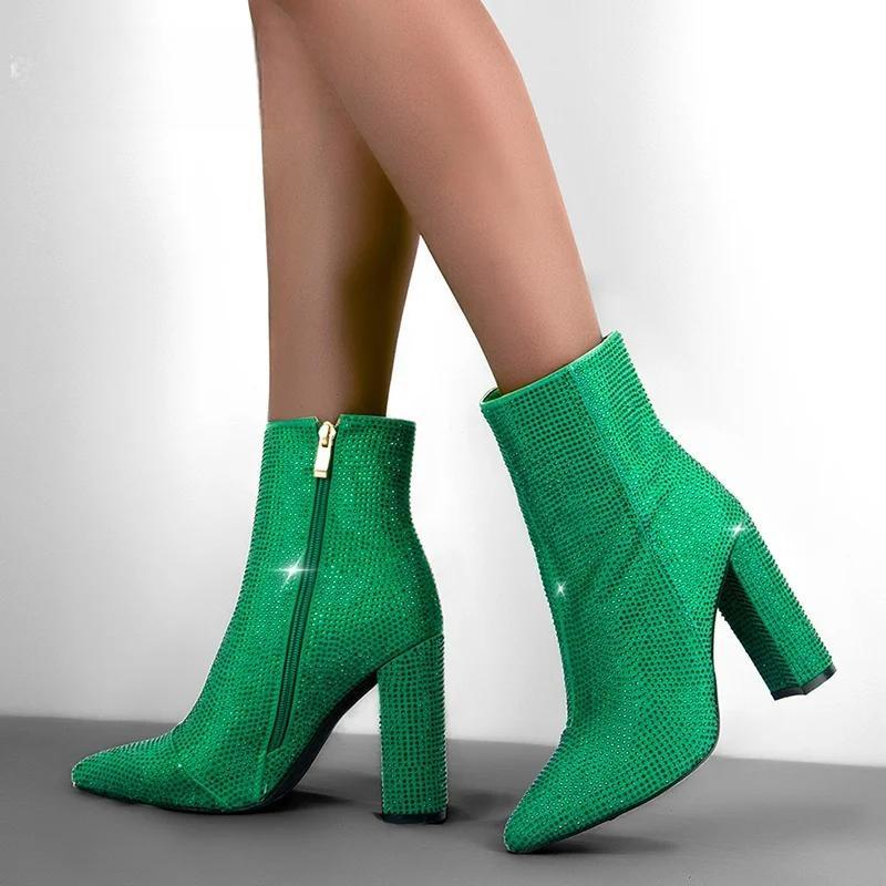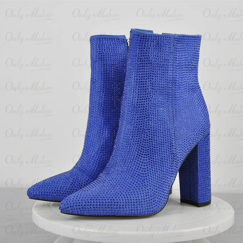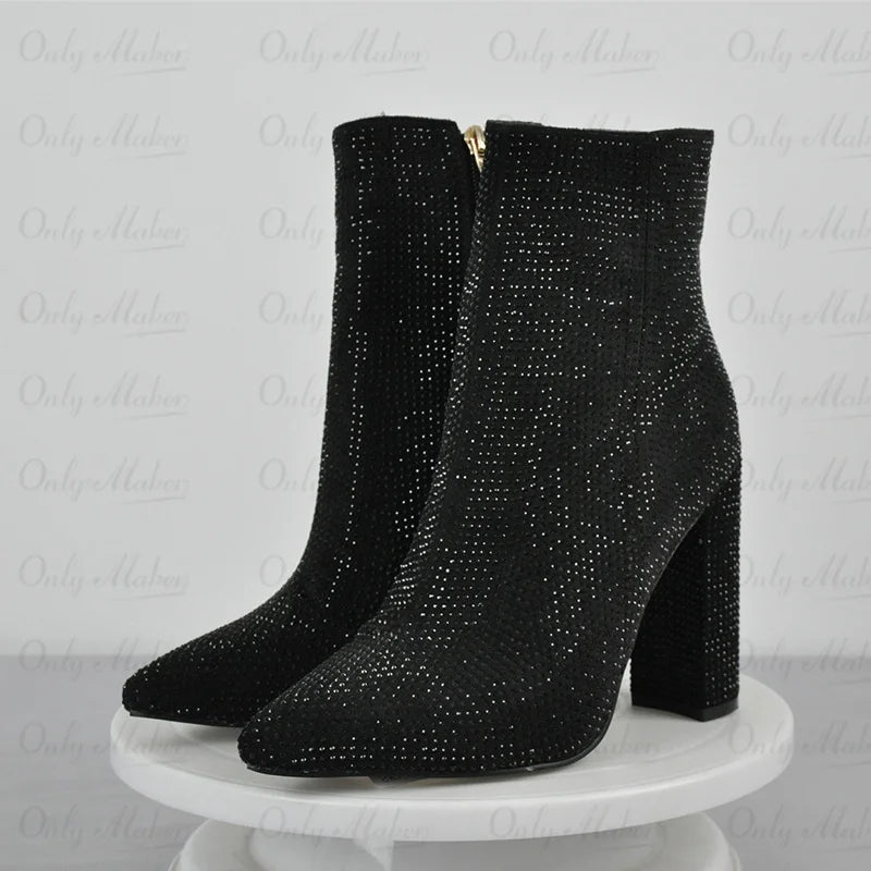 Botas de tacón cuadrado con cremallera y punta puntiaguda para mujer, botines de lujo con brillantes de imitación para fiesta, talla grande