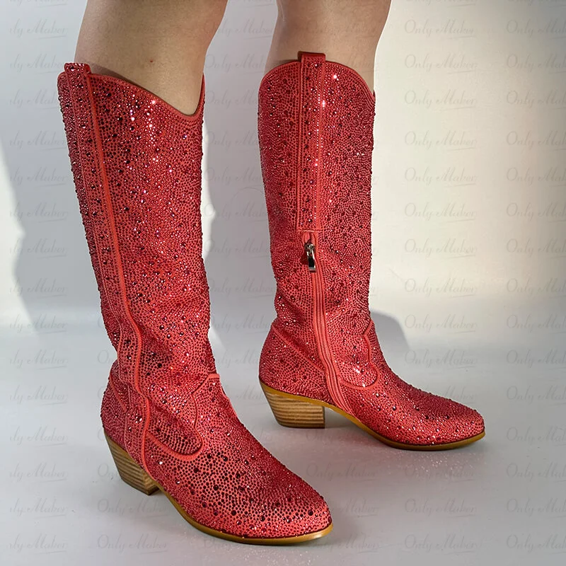 Botas rosas con diamantes de imitación para mujer, botas altas hasta la rodilla con brillo, punta puntiaguda brillante y tacón de bloque, botas vaqueras estilo western.