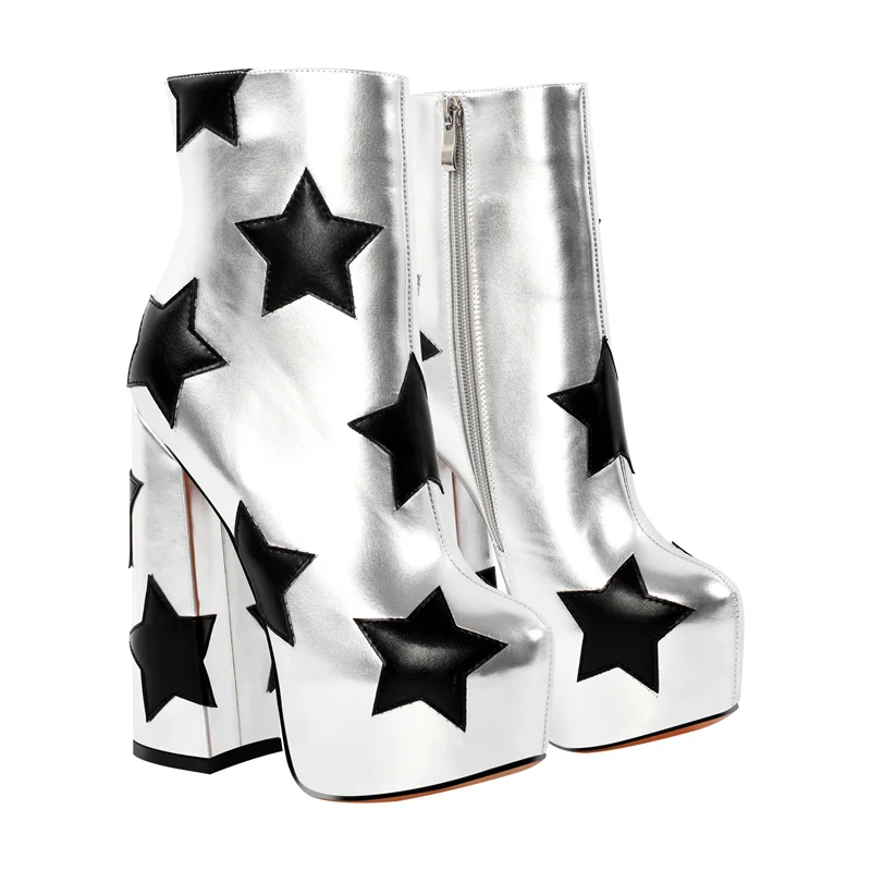 Botines de plataforma con punta redonda para mujer, tacón alto grueso, cremallera lateral, botines dorados de moda
