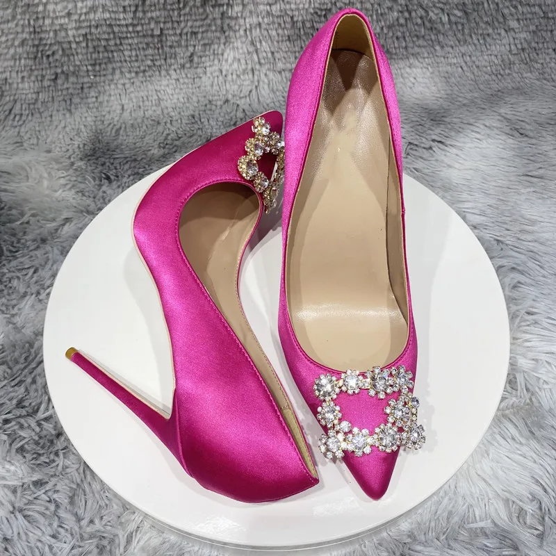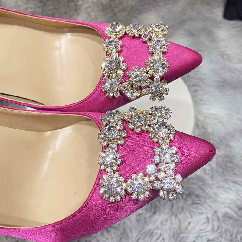 Zapatos de tacón alto y parte superior estrecha para mujer, zapatos de boda de tacón alto de seda rosa, moda rosa grande decorativo diamante artificial buc