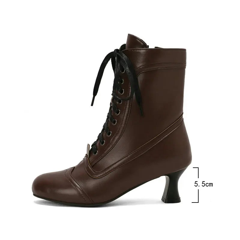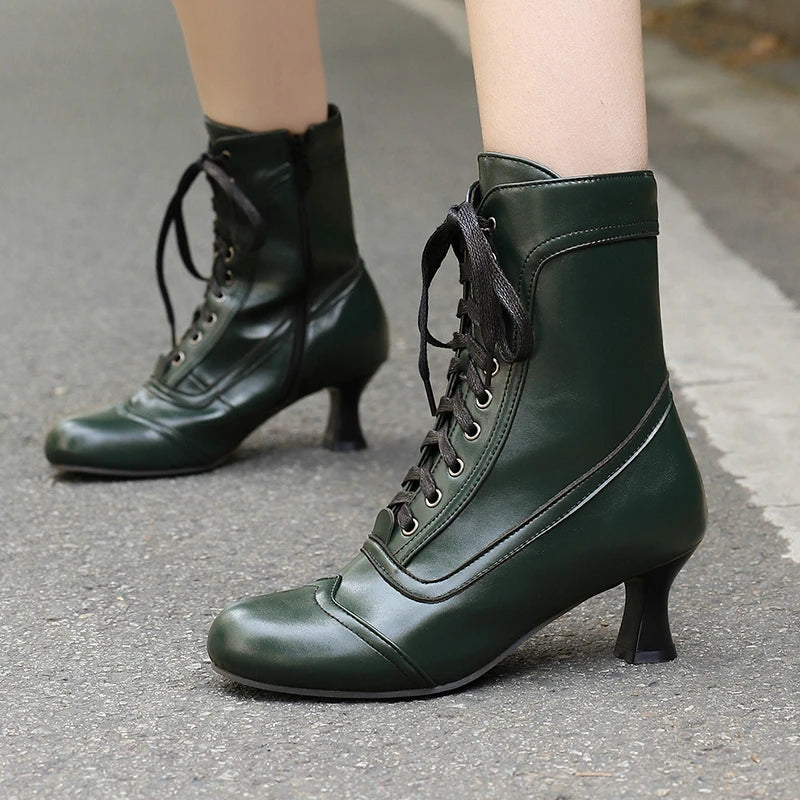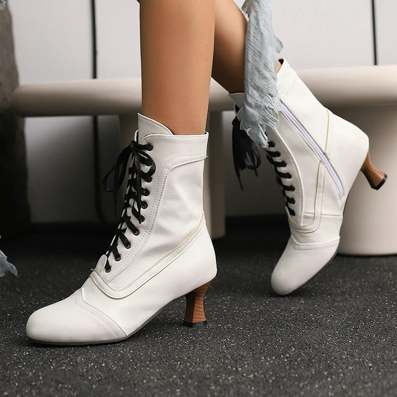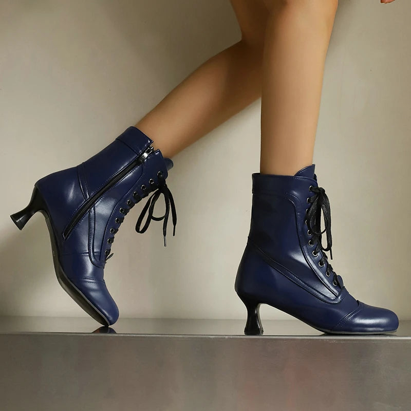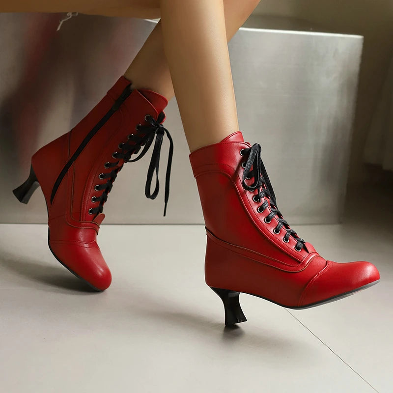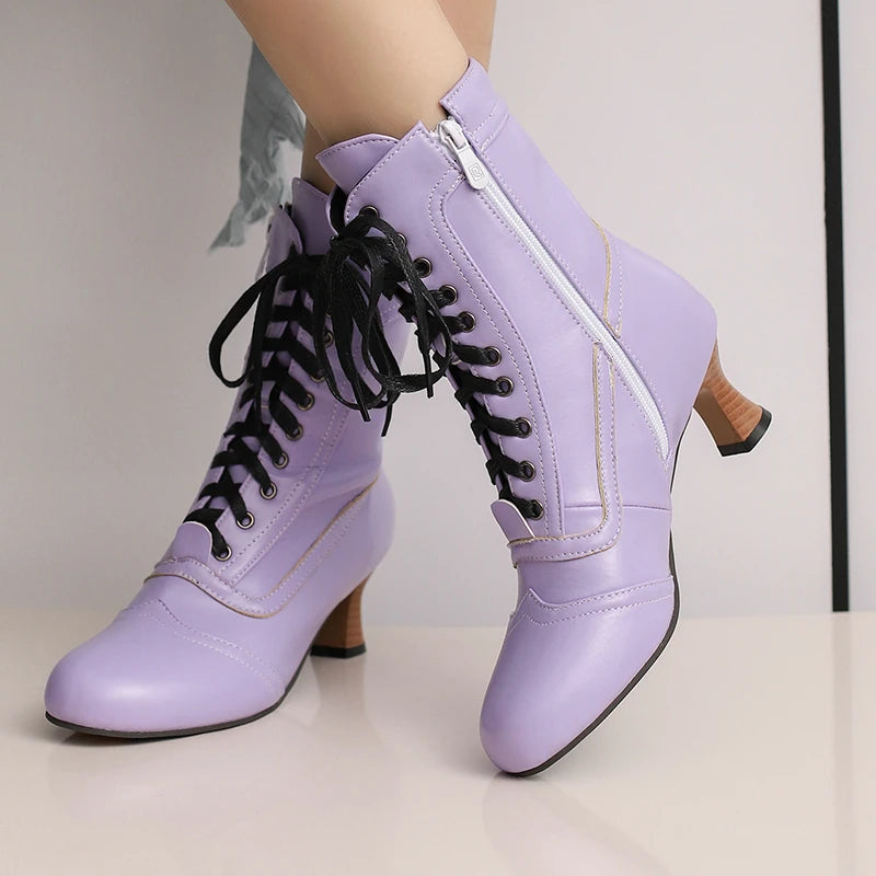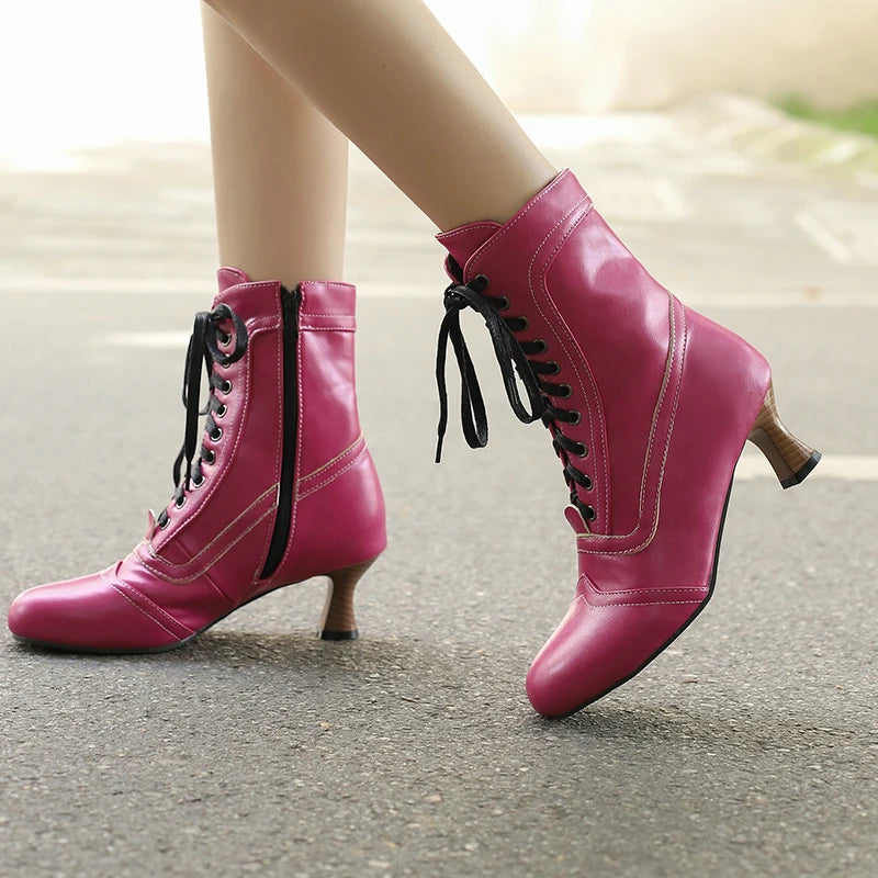 2025 Autumn Fall Women Ankle Boots Round Toe Square Heel Ladies Short Boots PU Leather Zipper Cross Tied Dress Women Boots Rose