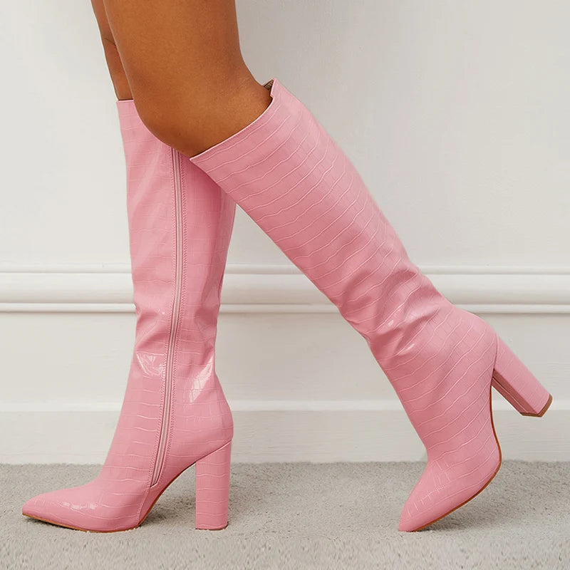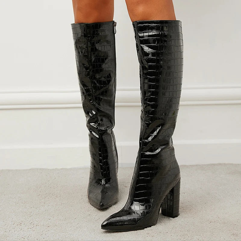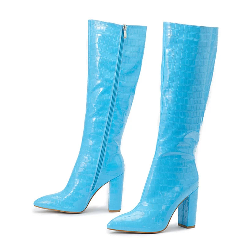 Autumn Winter Chunky Heels Black Blue Knee High Boots Femme Fashion Pointed Toe Zip Party Nightclub Motorcycle Women Long Shoes