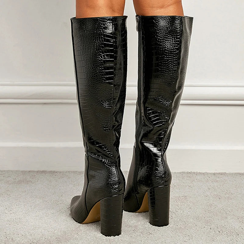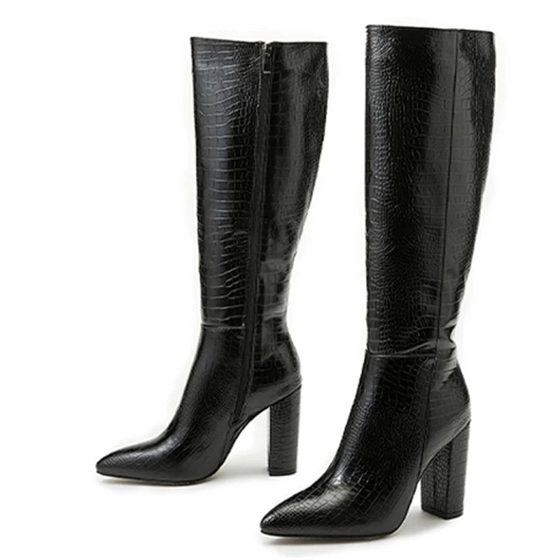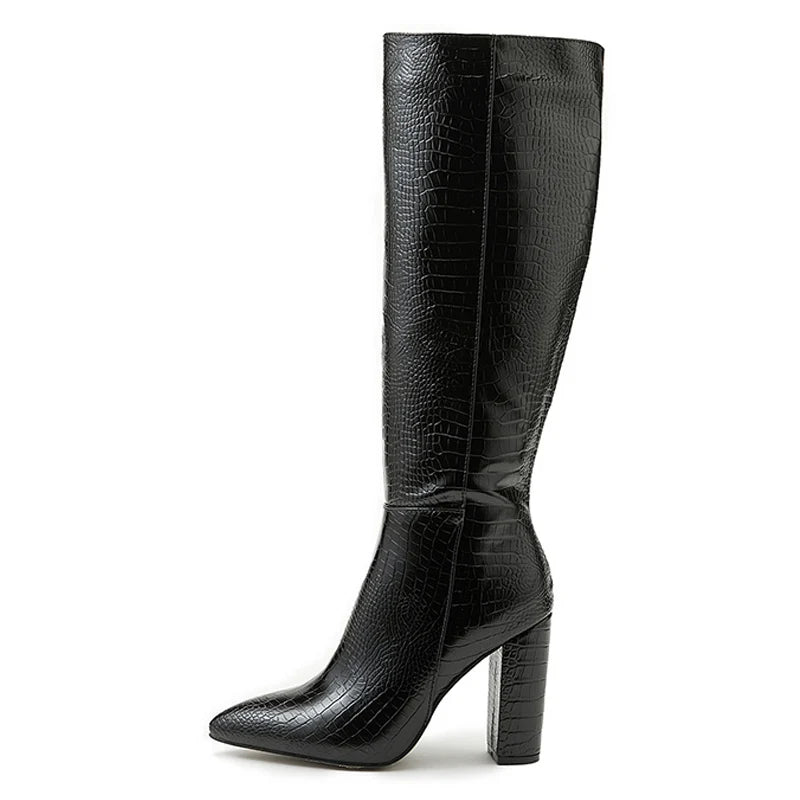 Black Knee High Boots Women Square Heels Casual Winter Motorcycle Long Shoes Pointed Toe Zip Fashion Cool Knight Bootties