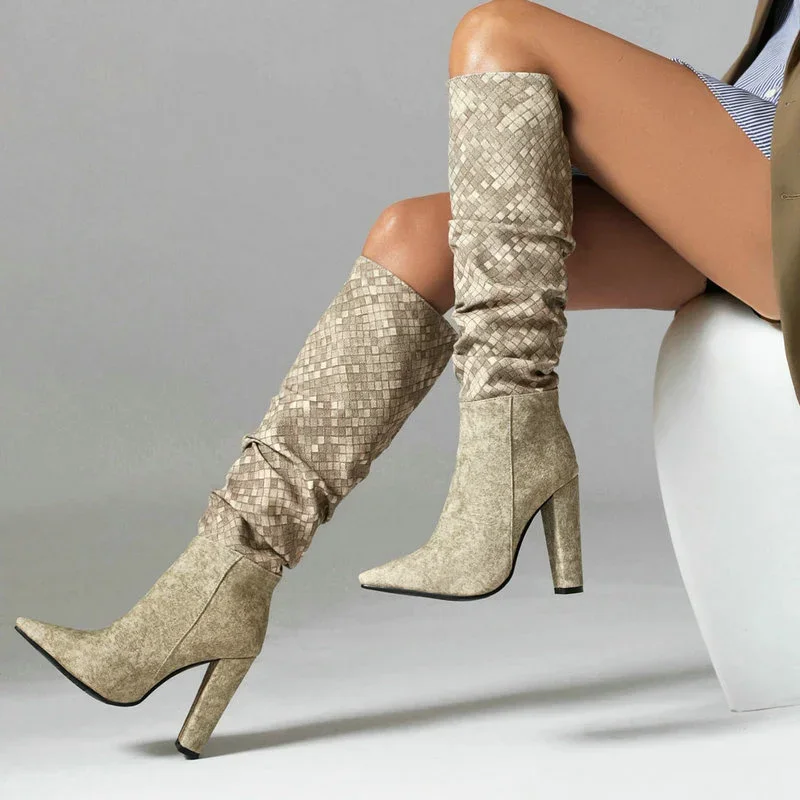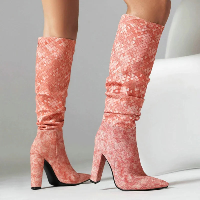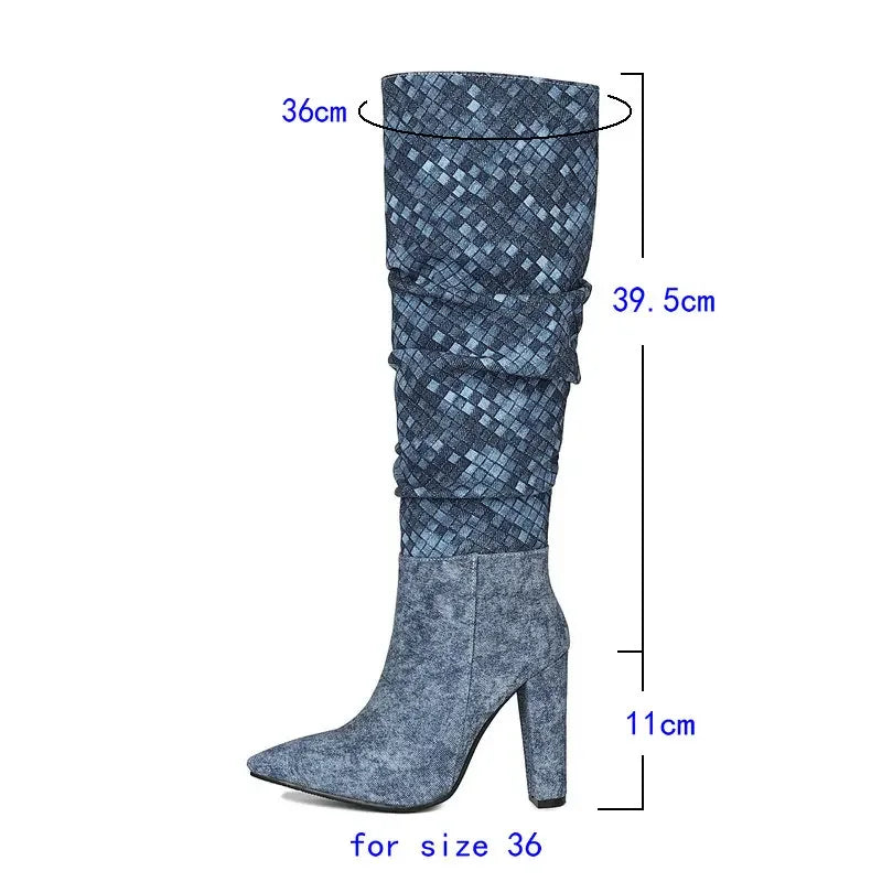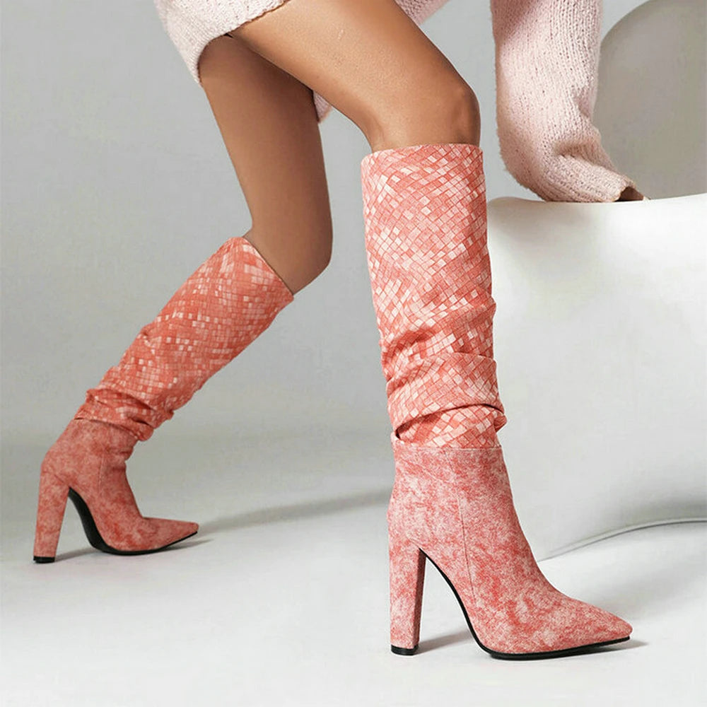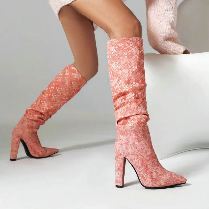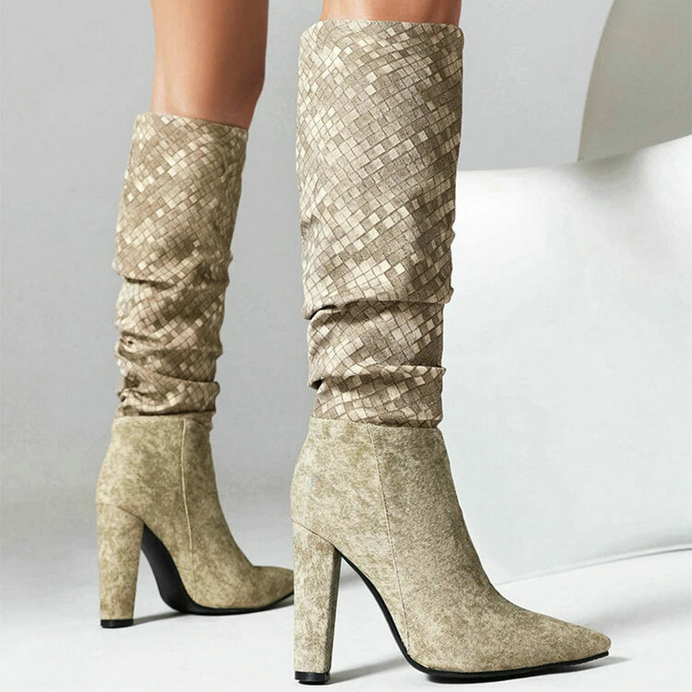 Blue Apricot Yellow Women Knee High Boots Pointed Toe Square High Heel Ladies Calf Boots Faux Suede Pleated Dress Women's Shoes