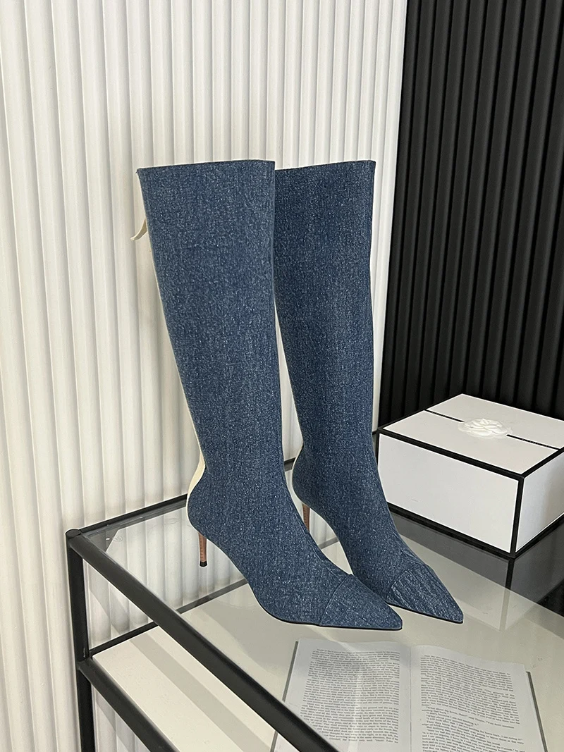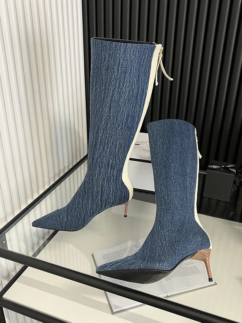 Blue Denim Stiletto Women Knee High Boots Fashion After Zip Pointed Toe Wooden Heels Ladies Motorcycle Shoes Botas Largas