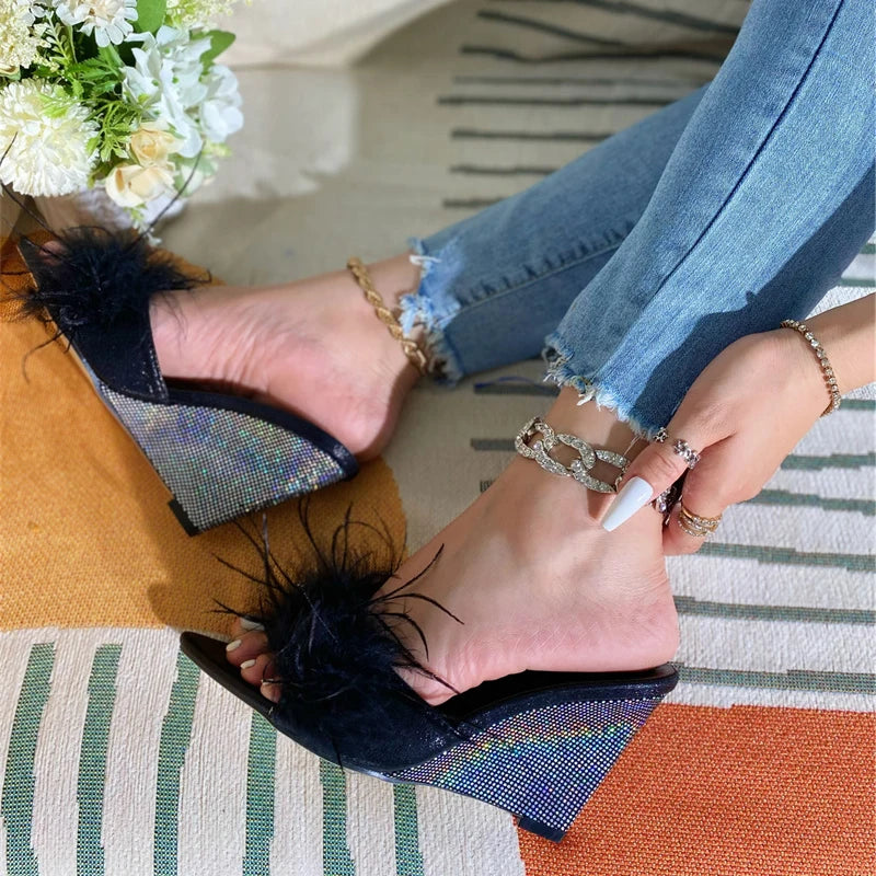 Blue Women Wedges Slippers Fashion Fluffy Feather Summer Sandals Pointed Toe Shallow Slides Shoes High Heels Mules Femme
