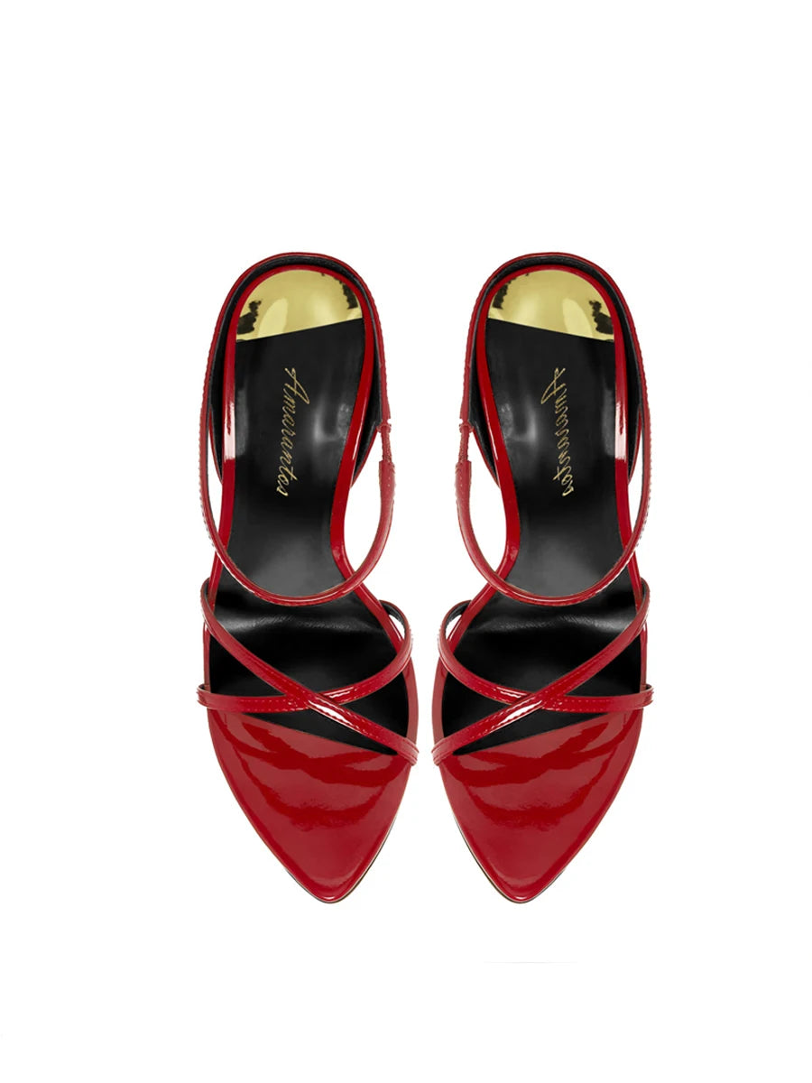 Celebrity style black slim heeled sandals with a feminine touch, pointed cross strap, red sole, high heels, open toed slippers
