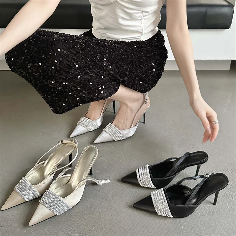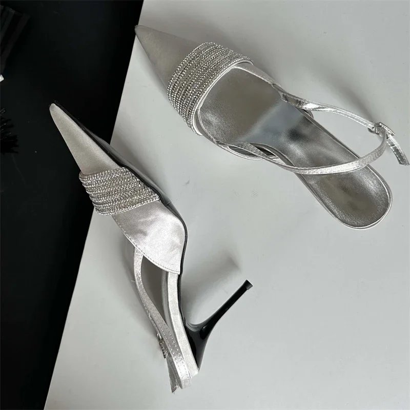CRYSTAL Rhinestone Silk Women Pumps Sexy Slingbacks Buckle Strap Prom Thin Heels Elegant Sandals Mule Shoes