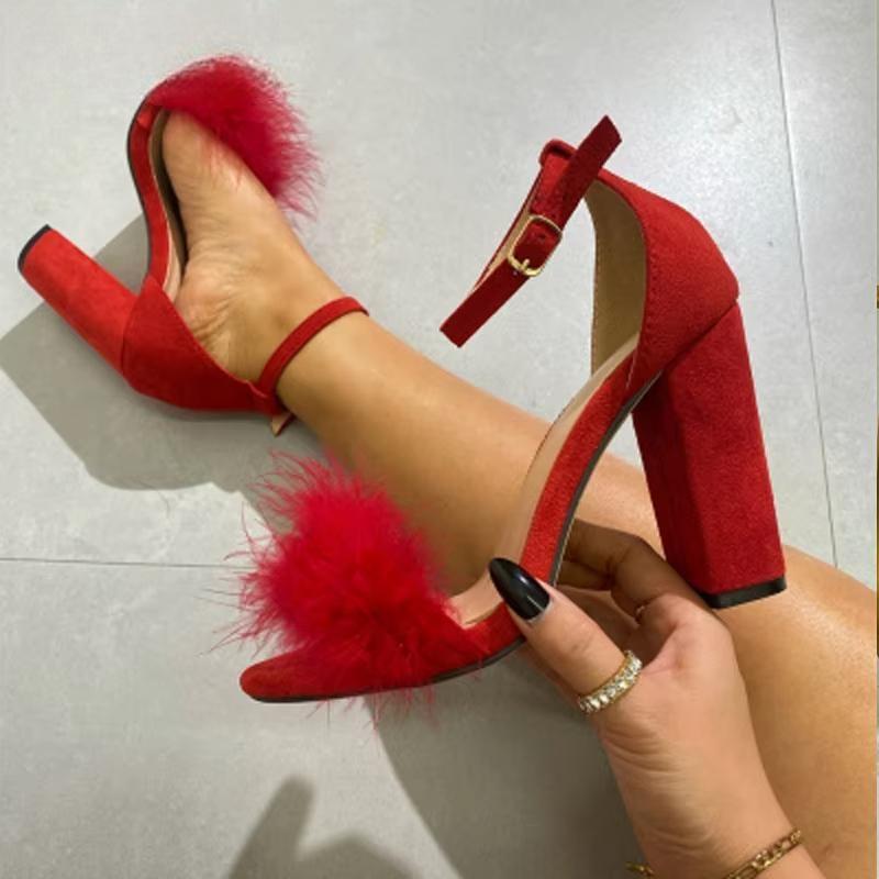 Design Womens Sandals Fashion Fuzzy Feather Summer Square Heel Buckle Strap GLADIATOR Nightclub Shoes