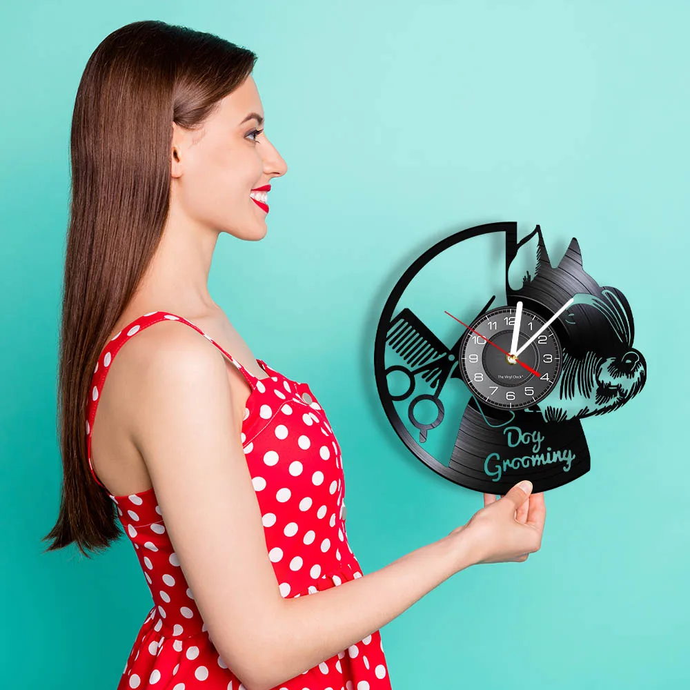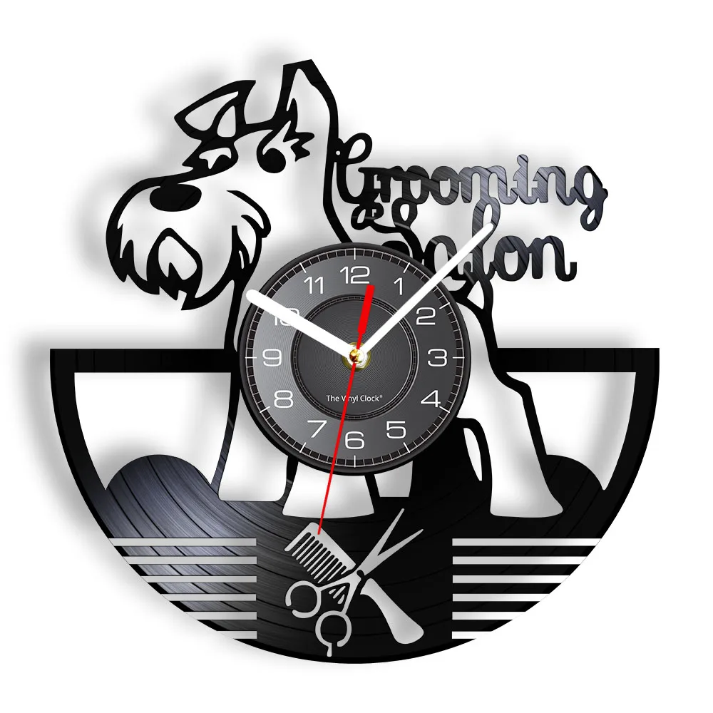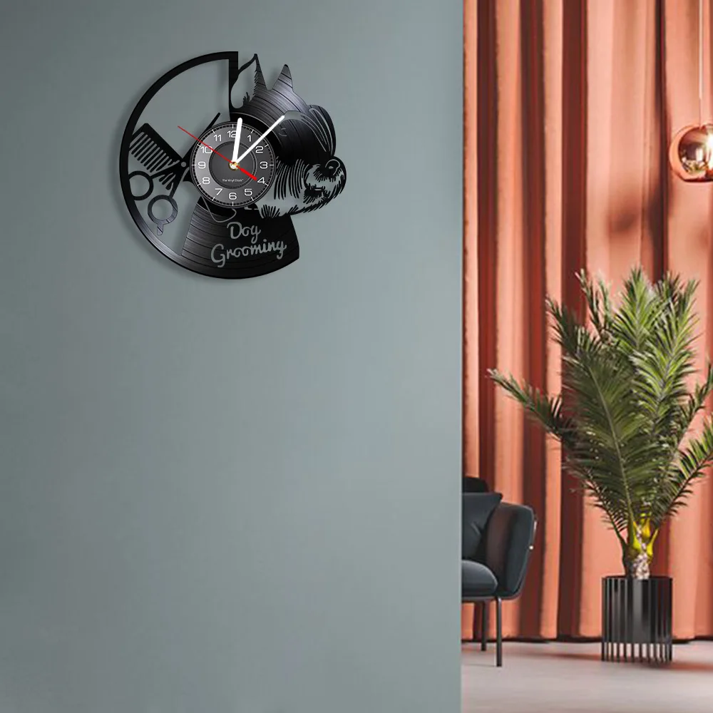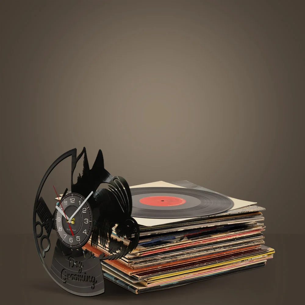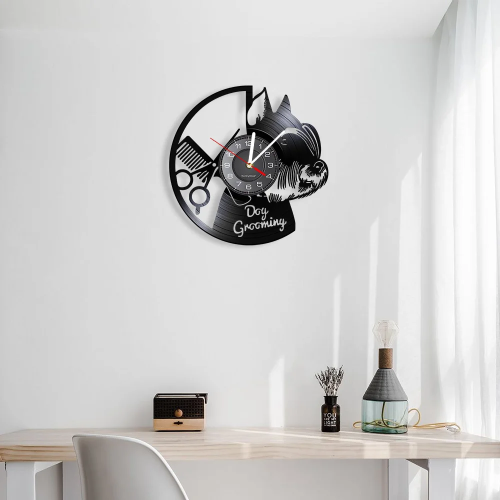 Dog Grooming Salon Vinyl Record Wall Clock Home Art Decor Scottish Terrier Puppy Dog Craft Wall Watch for Pet Shop Groomer Gift