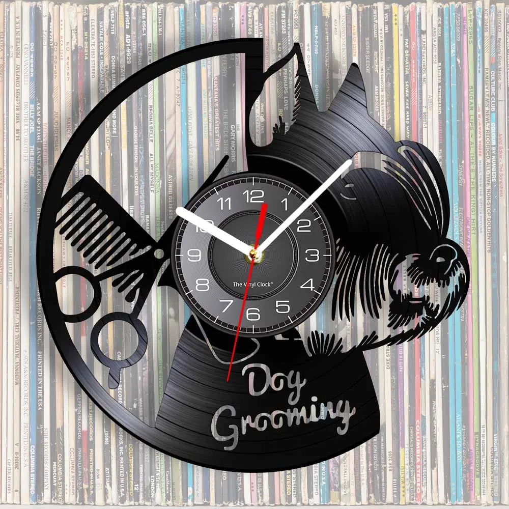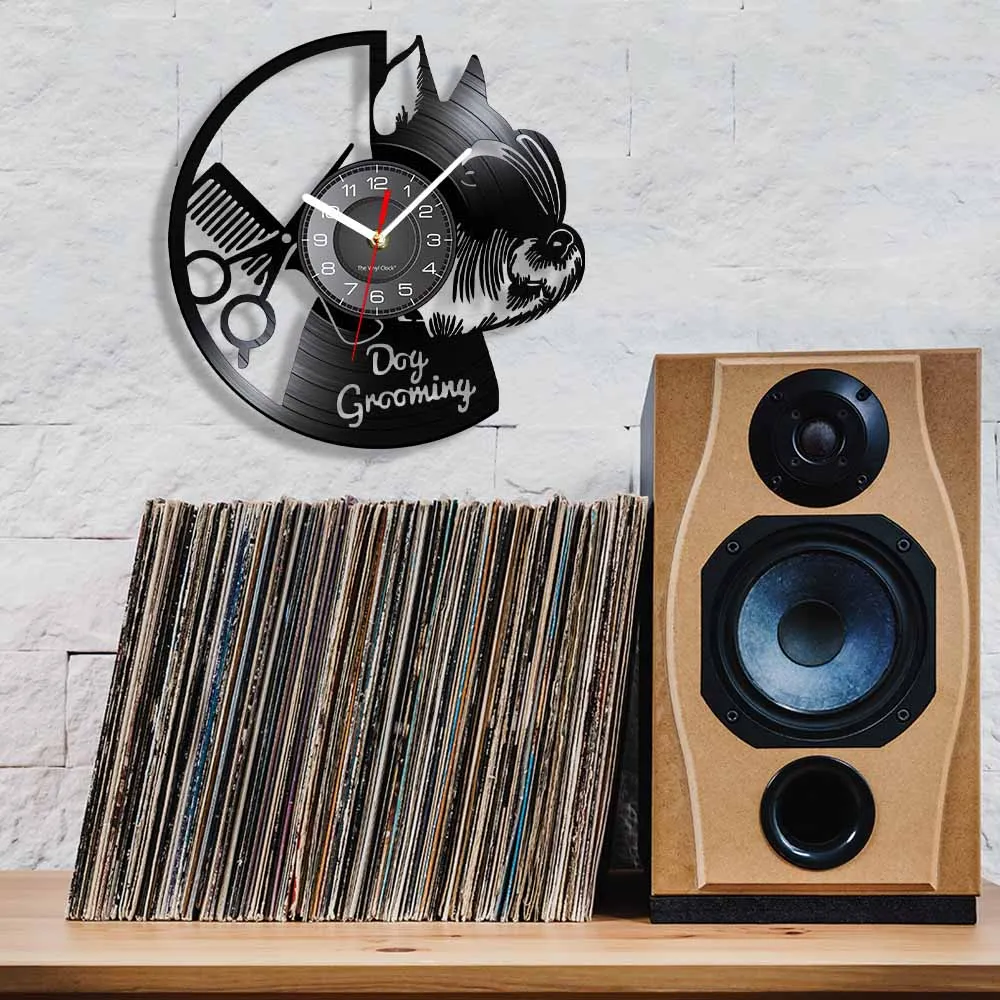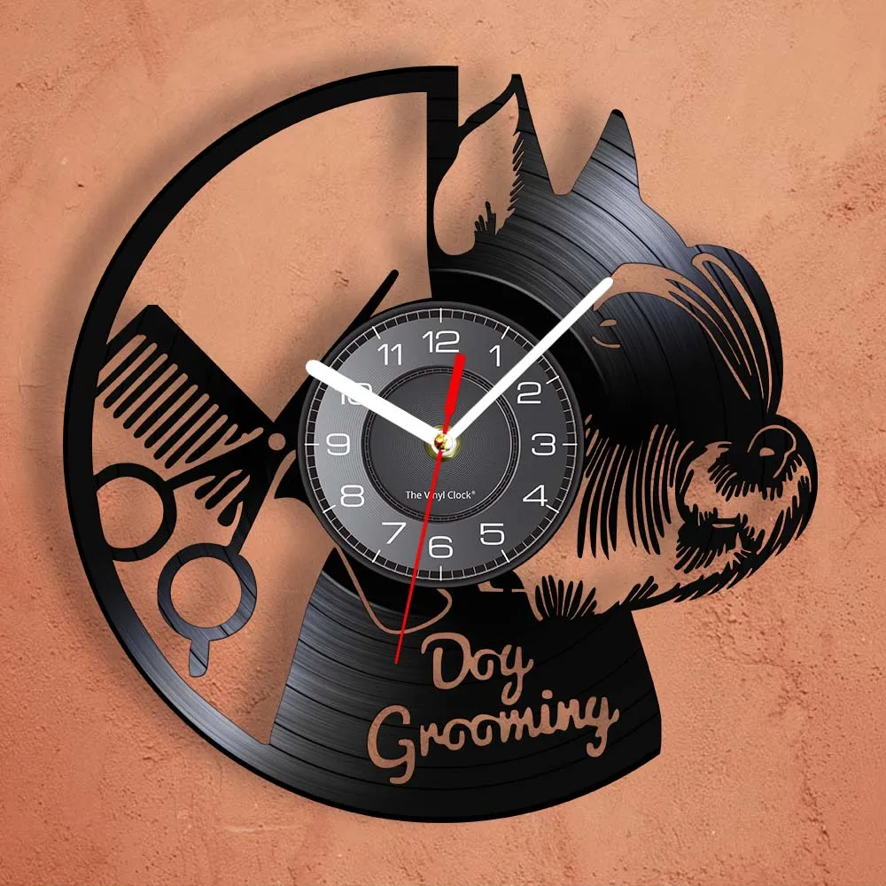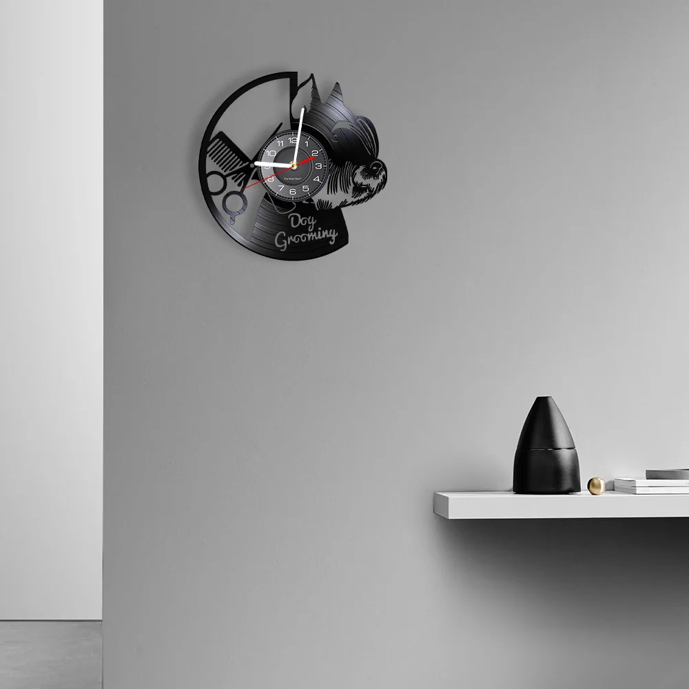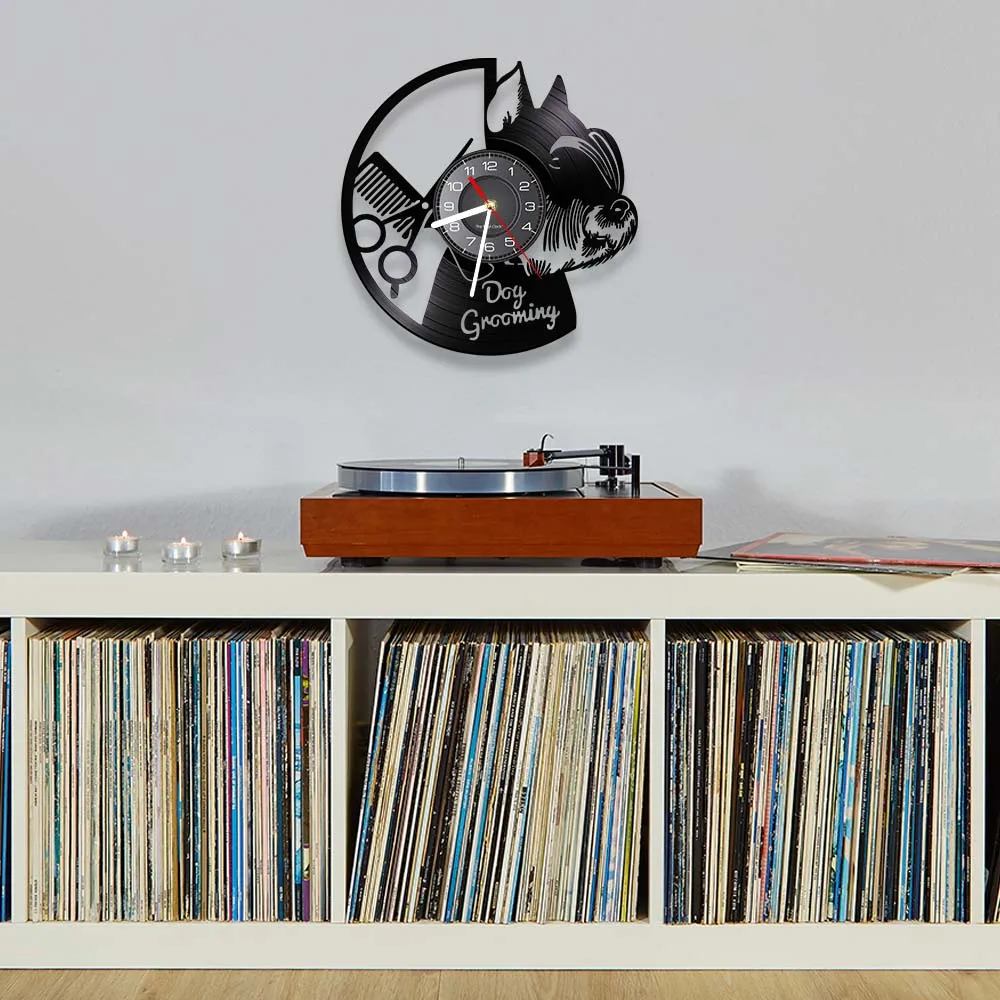 Dog Grooming Salon Vinyl Record Wall Clock Home Art Decor Scottish Terrier Puppy Dog Craft Wall Watch for Pet Shop Groomer Gift