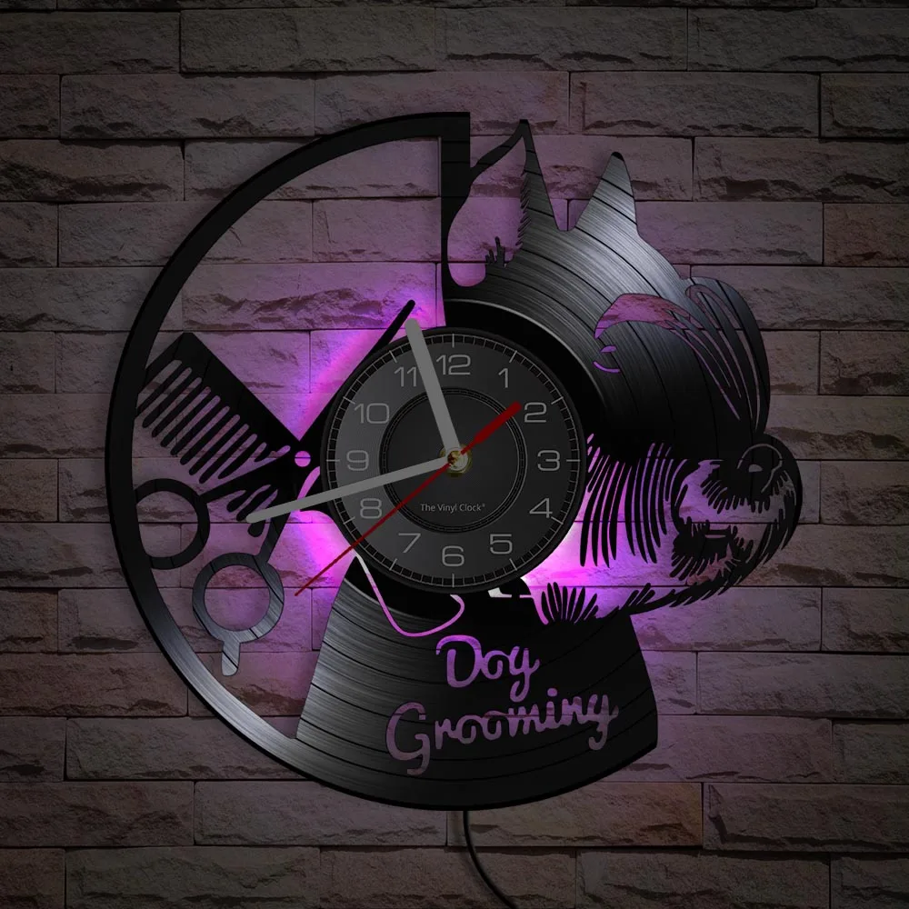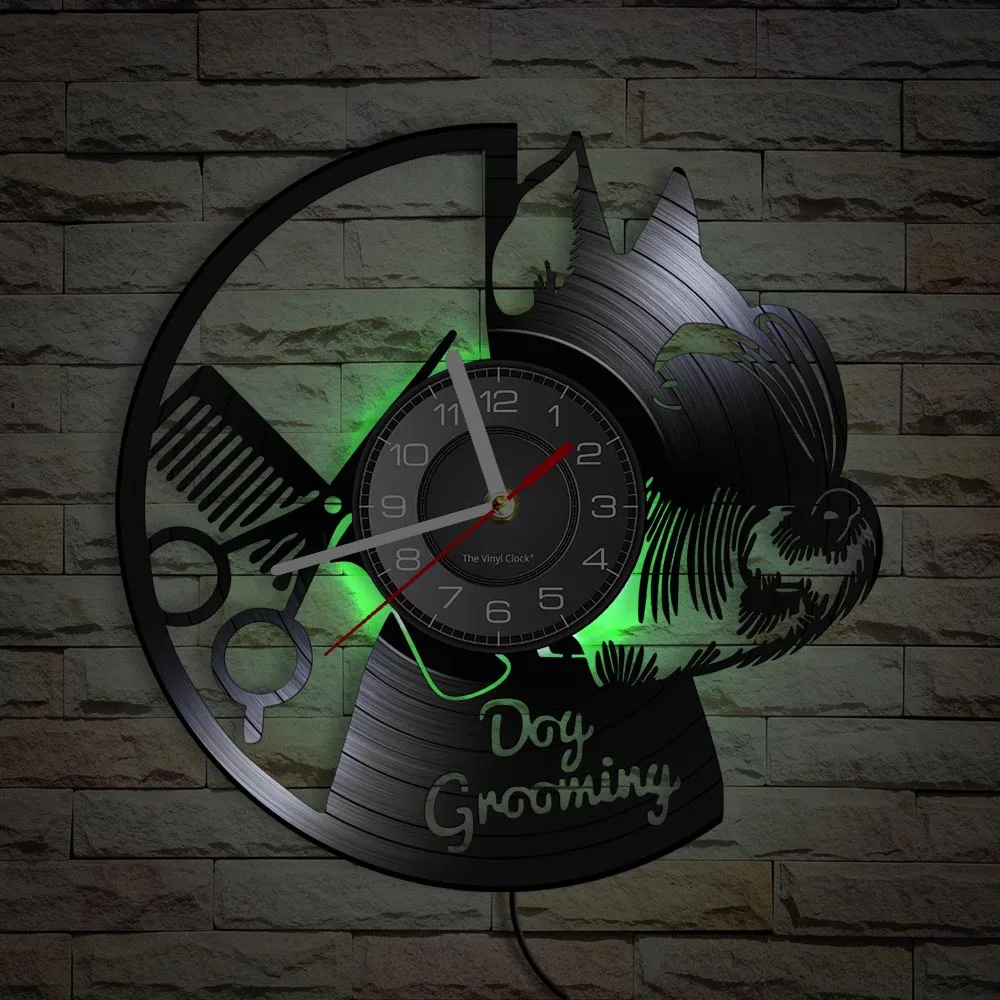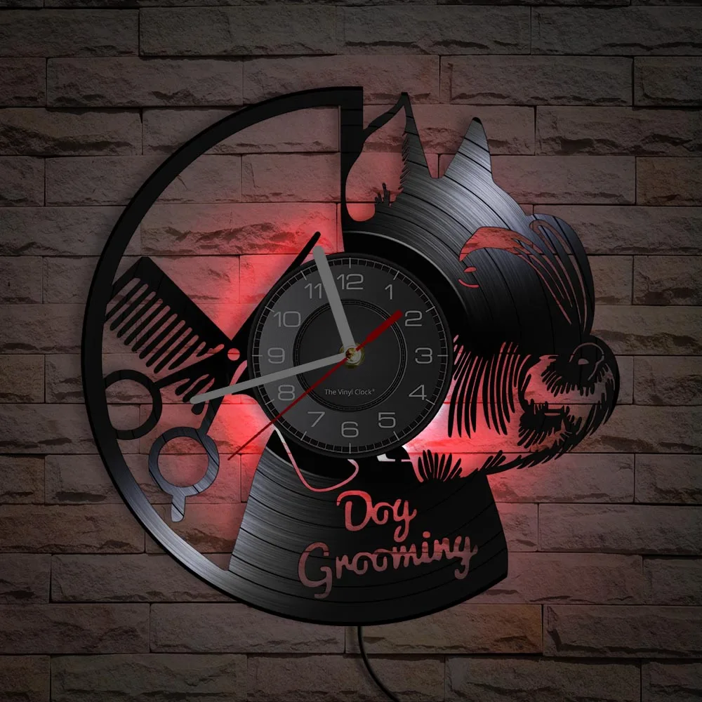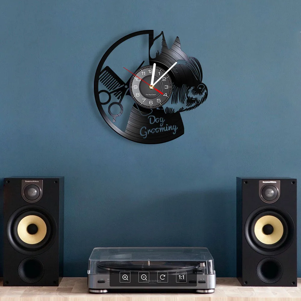 Dog Grooming Salon Vinyl Record Wall Clock Home Art Decor Scottish Terrier Puppy Dog Craft Wall Watch for Pet Shop Groomer Gift