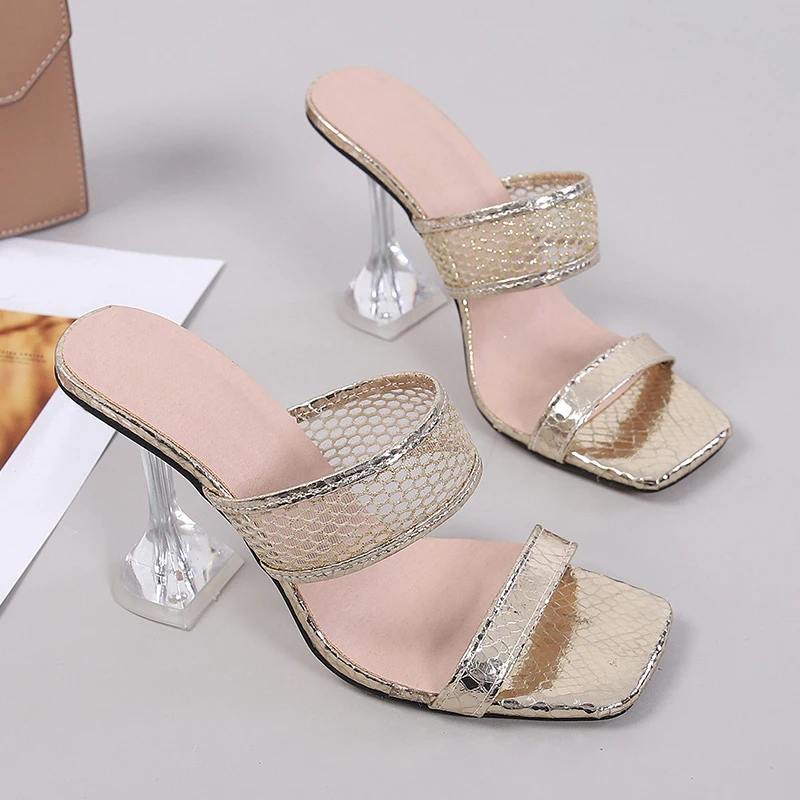 Elegant Square Toe Transparent Spike Heels Pumps Mesh Slippers Summer Women