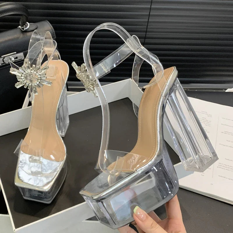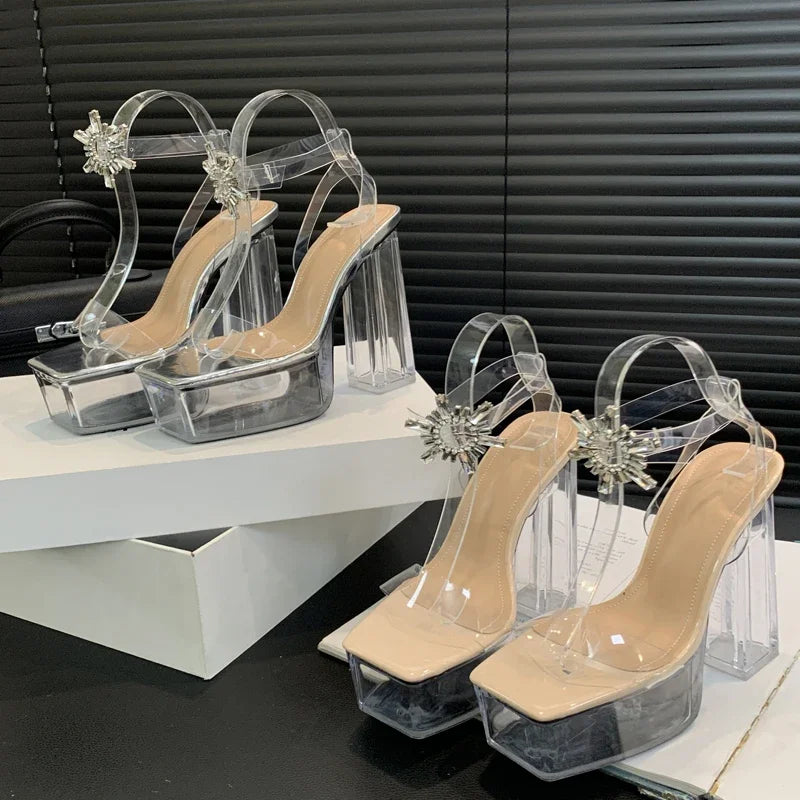 Fashion Chunky Crystal Platform Women Sandals Summer Open Toe Buckle Strap Transparent Square High Heels Shoes
