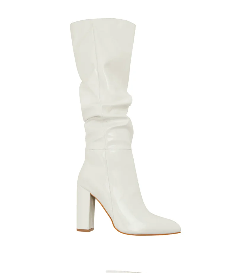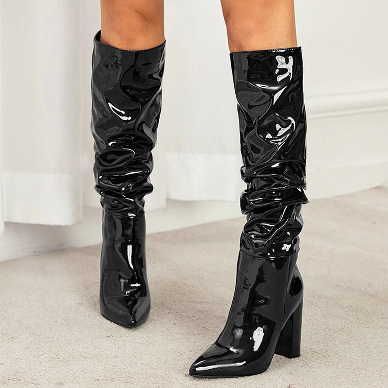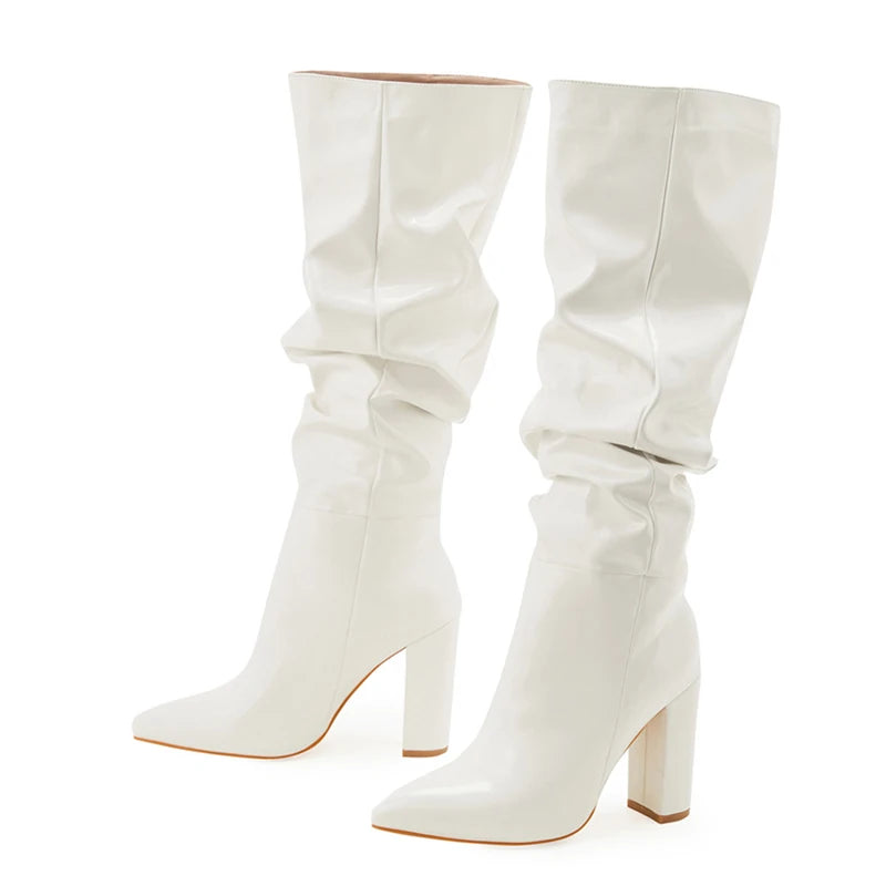 Fashion Cozy White Pleated Patent Leather Knee High Boots Autumn Winter Women Shoes Sexy Pointed Toe Square Heels Pumps