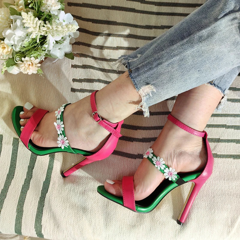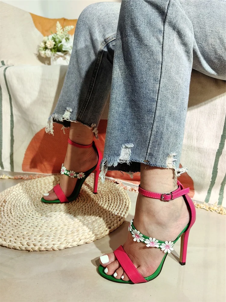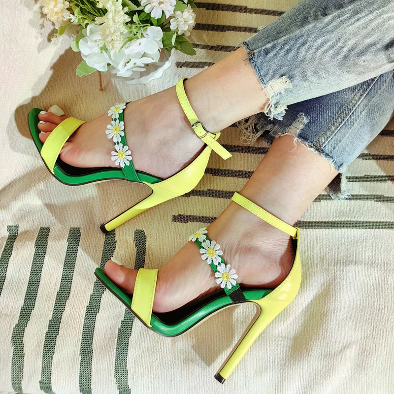 Fashion Design Sunflower Narrow Band Women Sandals Mixed Color Buckle Strap Summer Party Thin Heels Zapatos Mujer