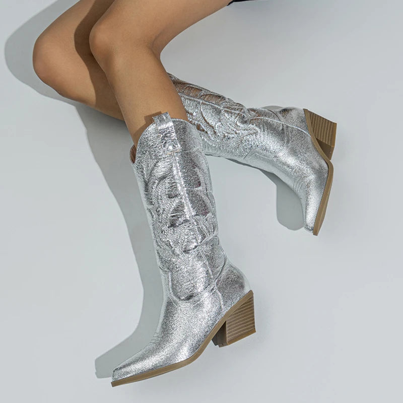 Fashion Embroidered Western Cowboy Boots For Women Leather Golden Silver Pointed Toe Low Hoof Heels Slip On Mid-Calf Shoes