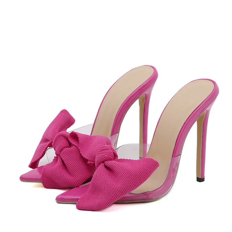 Summer Thin High Heels Slippers Women Fashion Green Mesh Bowknot Pointed Toe Party Stripper Shoes PVC Transparent Sandals