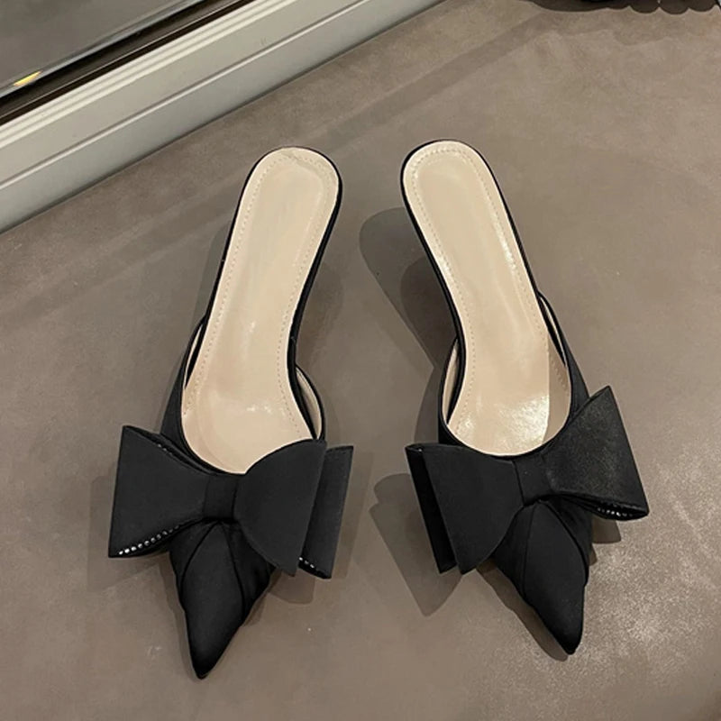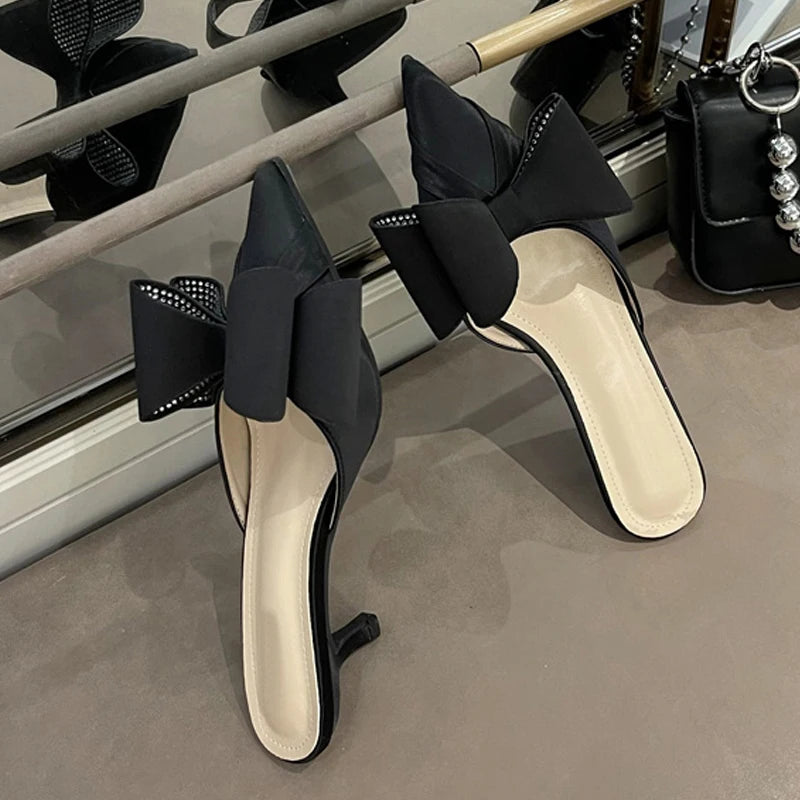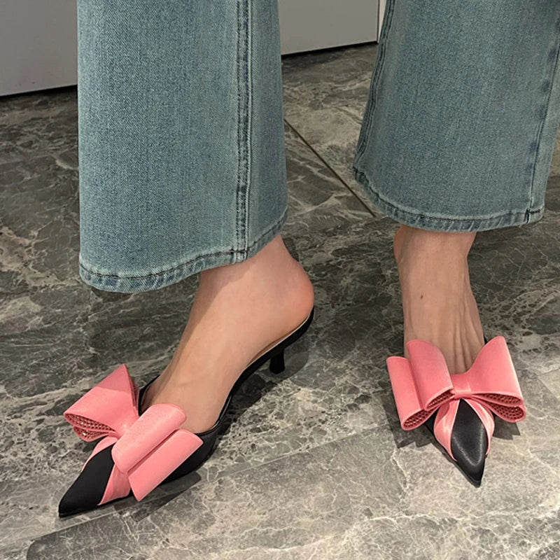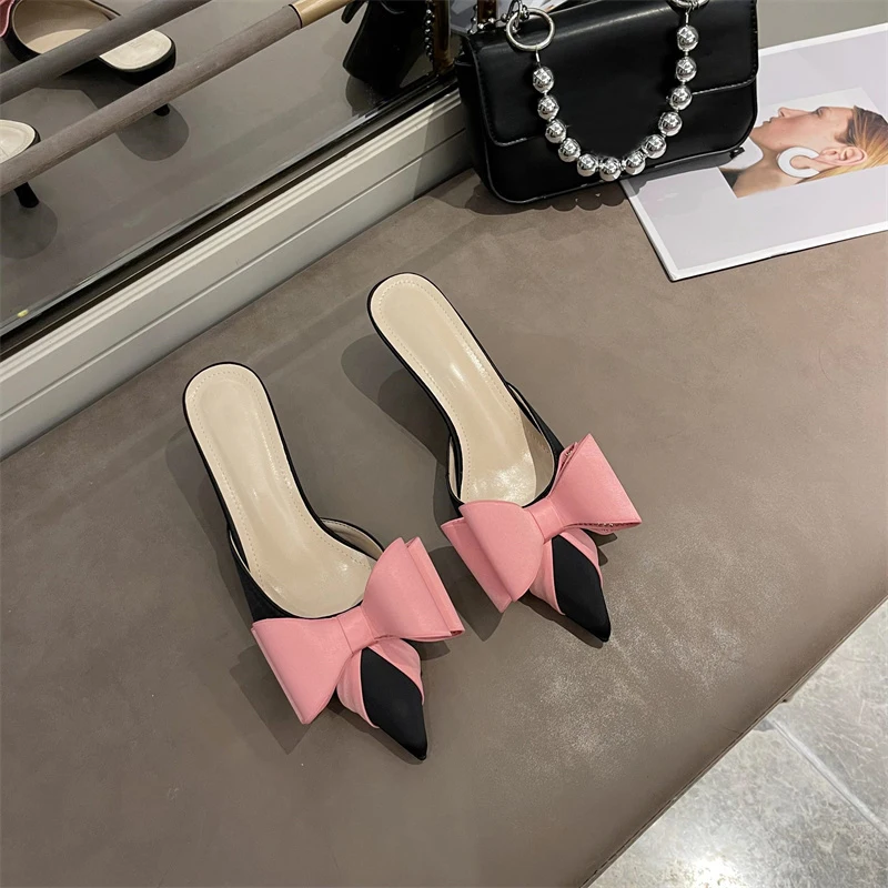 New Fashion Pink Rhinestone Butterfly-Knot Women Pumps Slippers Sandals Pointed Toe Low Thin Heels Mules Female Shoes
