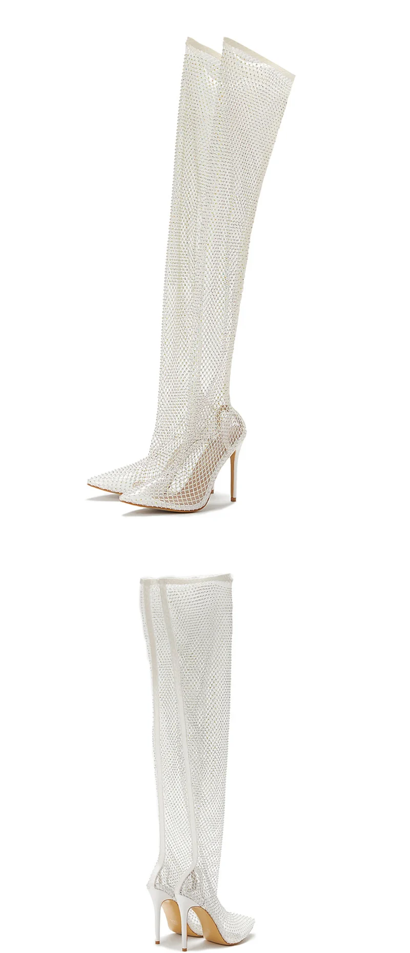Fashion Rhinestone Fishnet Mesh Women Pumps High Heels Socks Over-The-Knee Boots