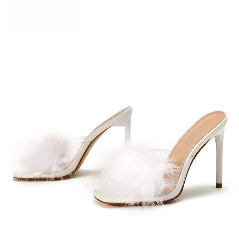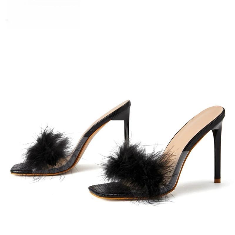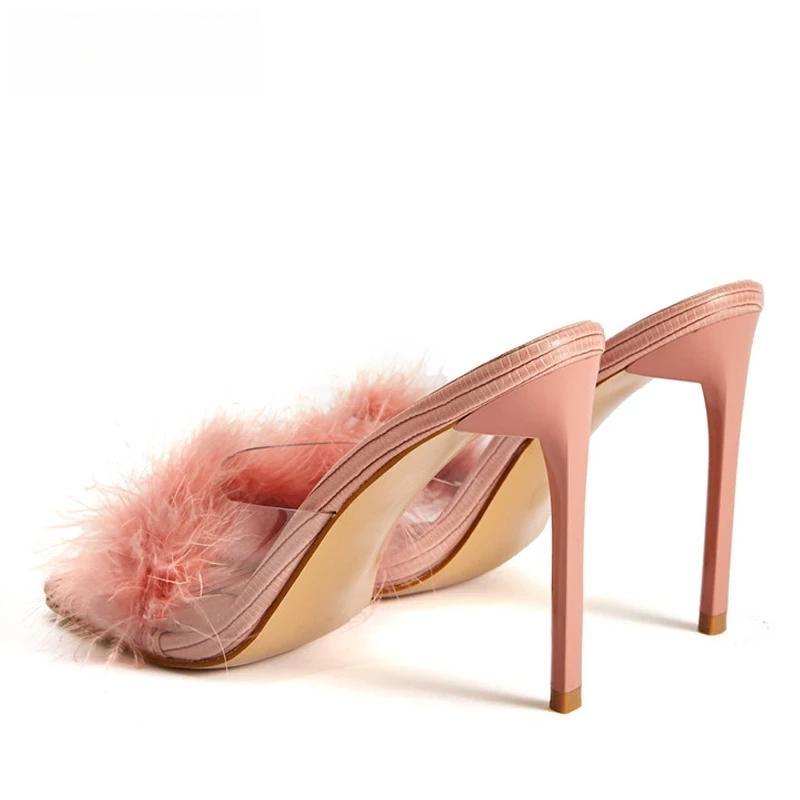 Feather Thin Heels Fur PVC Slippers Sandals Women Peep Toe Mules Lady Pumps Slides Shoes Size 35-42