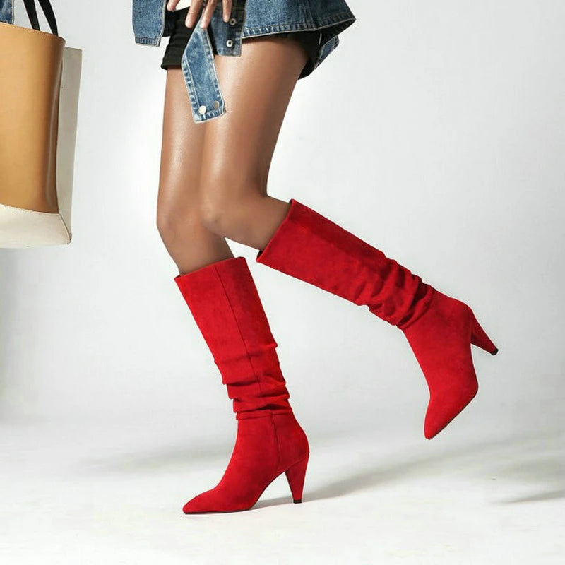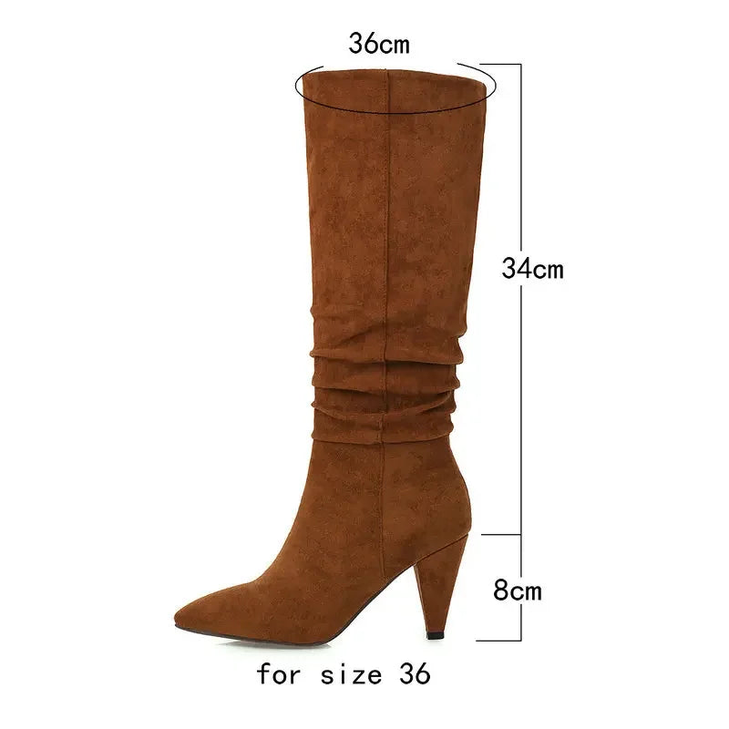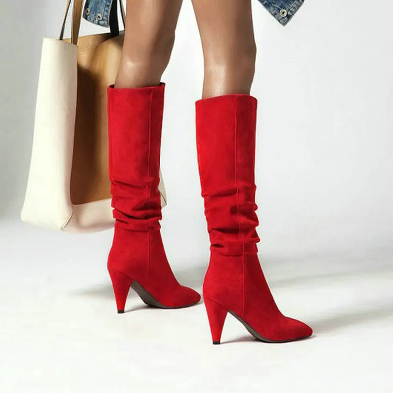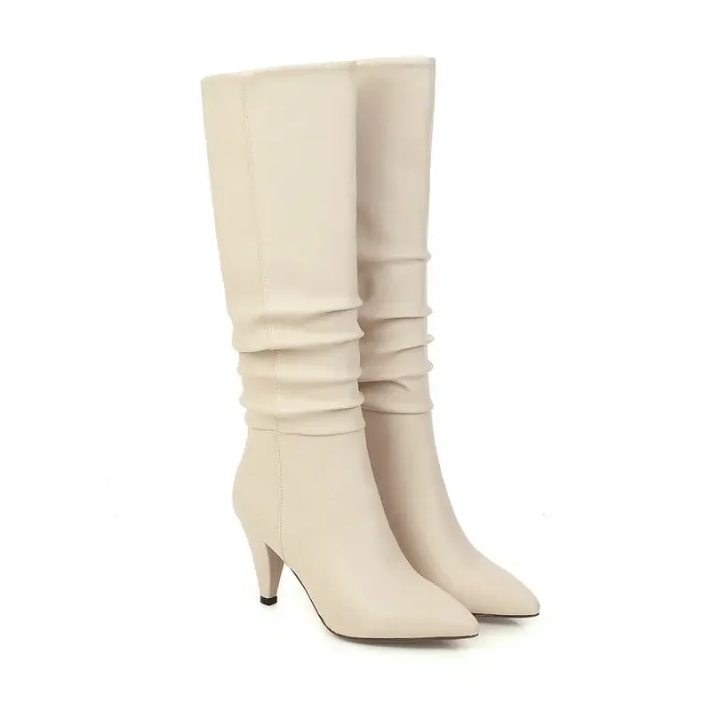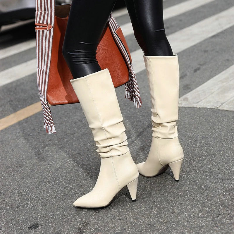 Flock Brand Design Women Knee High Boots Spike High Heel Women Pointed Toe Boots Fashion Pleated Women's Shoes Black Red Beige