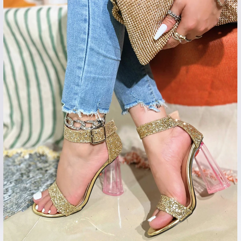 Gold Silver Bling Fashion Ankle Buckle Strap Sandals Gladiator Cover Square Heel Women Open Toe Sexy Summer Party Shoes