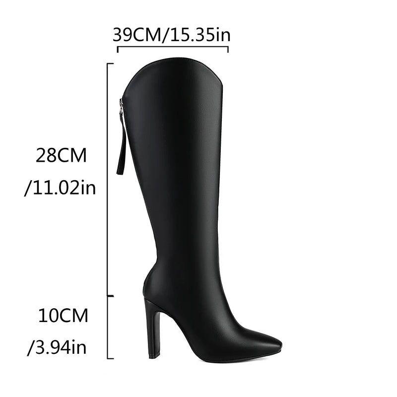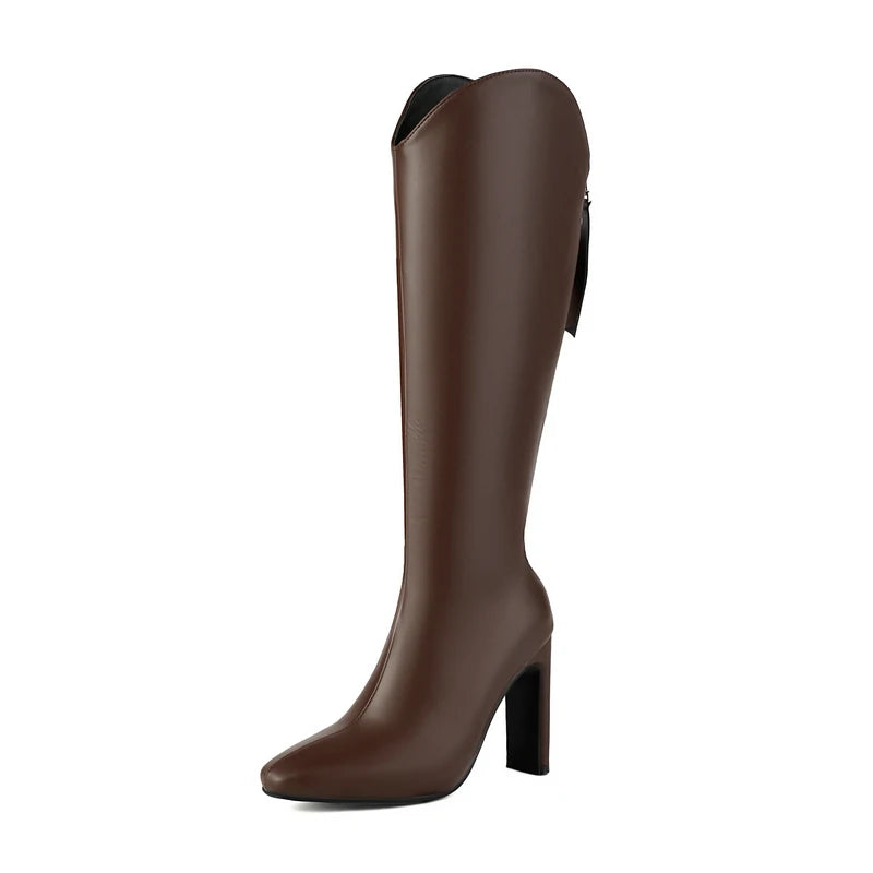 Gold Silver Brown Women Knee High Boots Round Toe Square High Heel Ladies Calf Boots PU Leather Back Zipper Dress Women Boots
