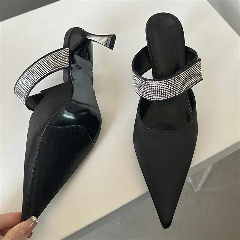 High Quality CRYSTAL Satin Woman Pumps Slippers Woman Fashion Pointed Toe Shallow Slip On Dress Shoes