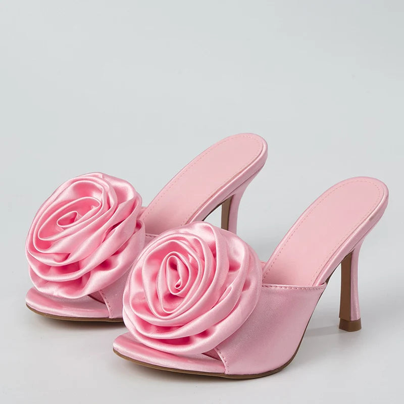 New Brand Women's Slippers Fashion Pink Flowers Design Thin High Heels