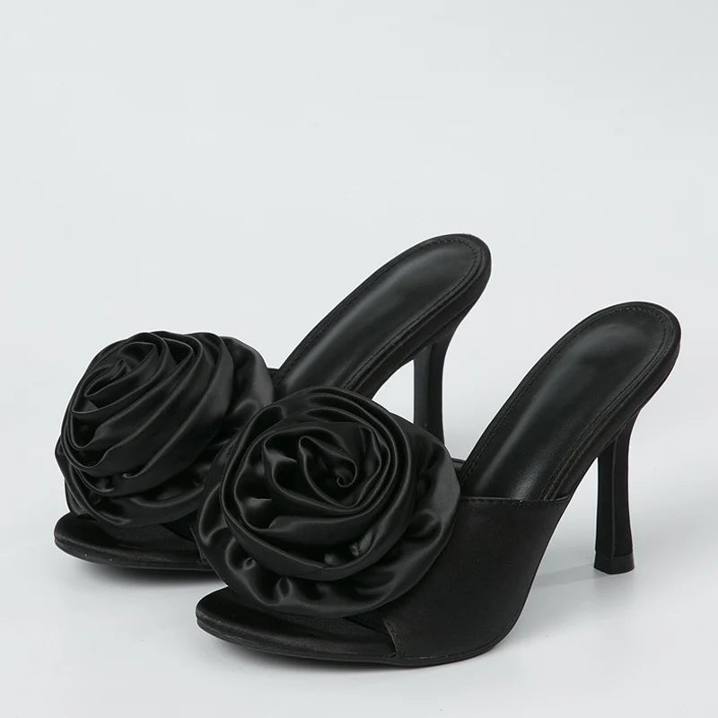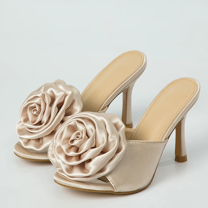 New Brand Women's Slippers Fashion Pink Flowers Design Thin High Heels Sliders Shoes Open Toe Summer Sandals Size 35-42