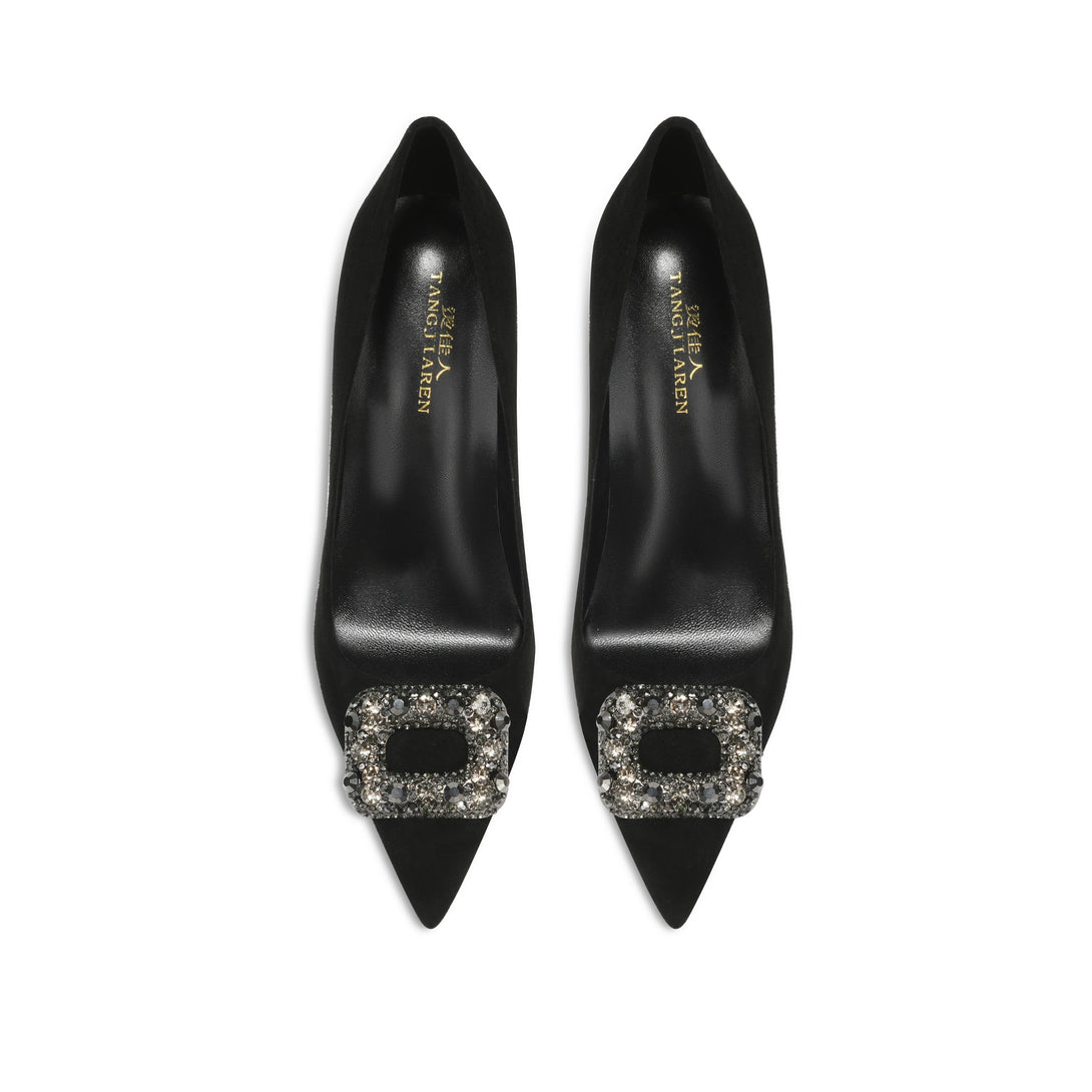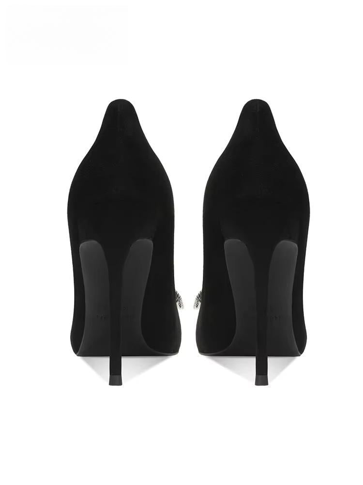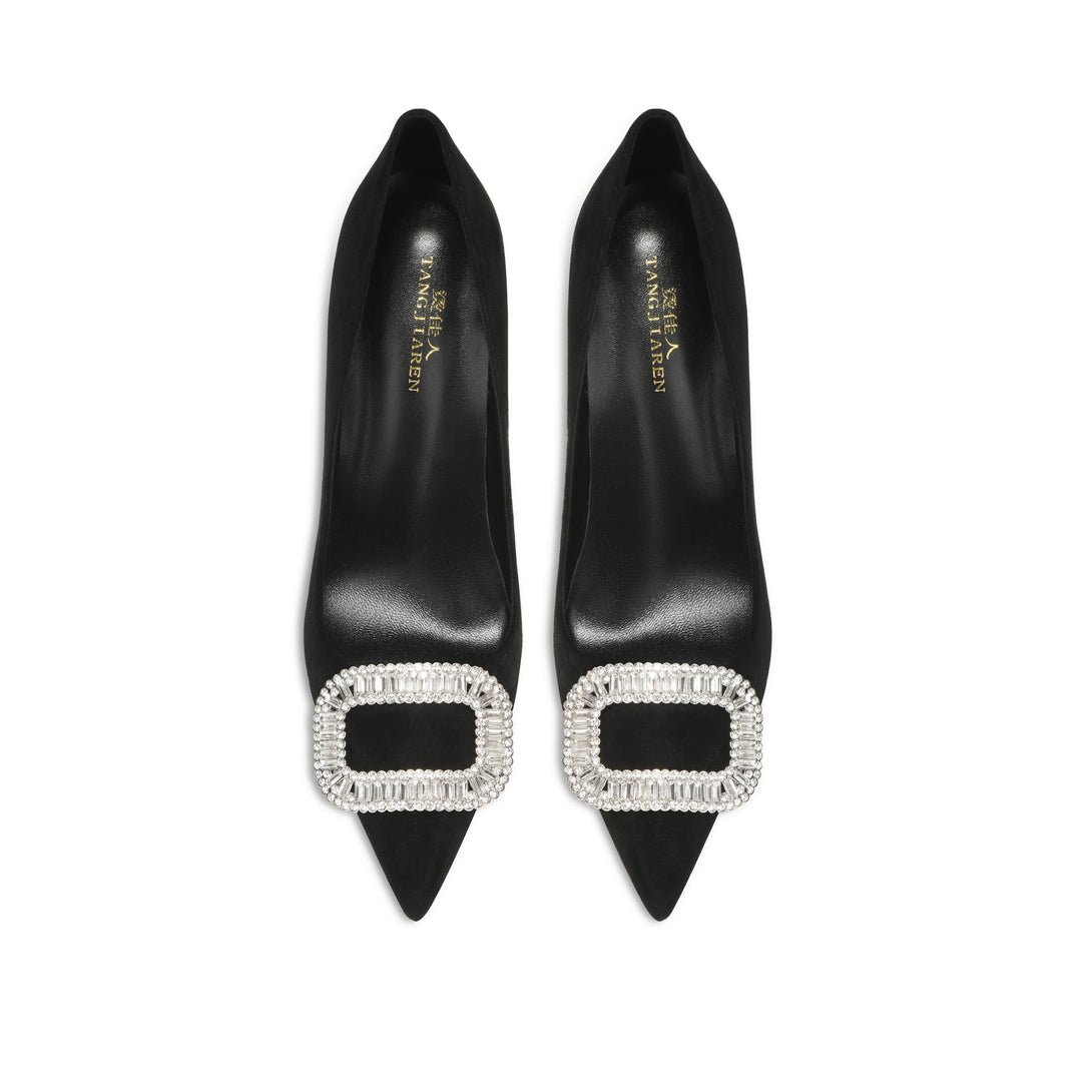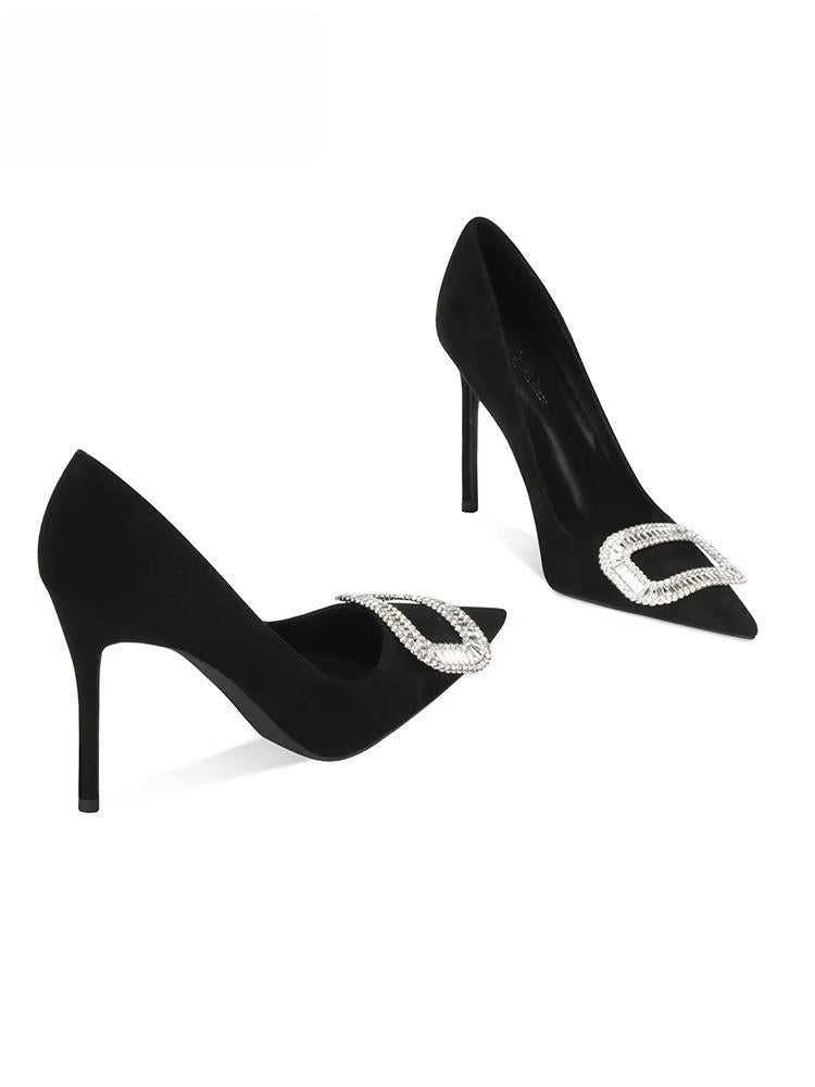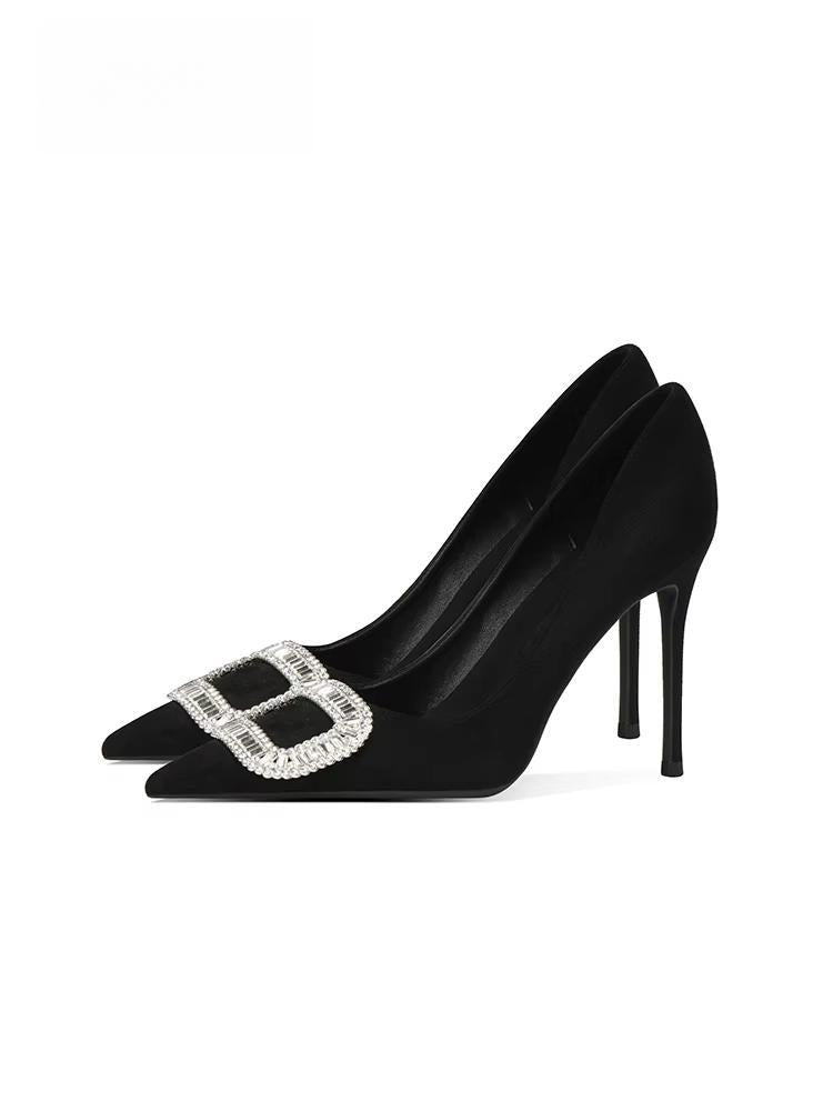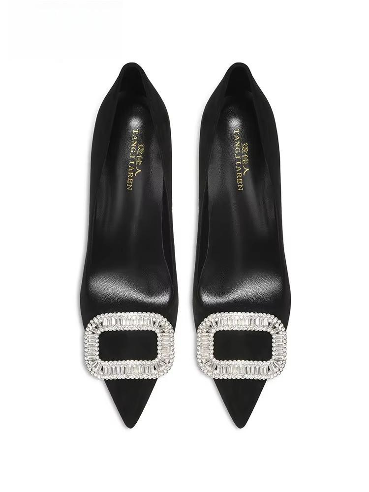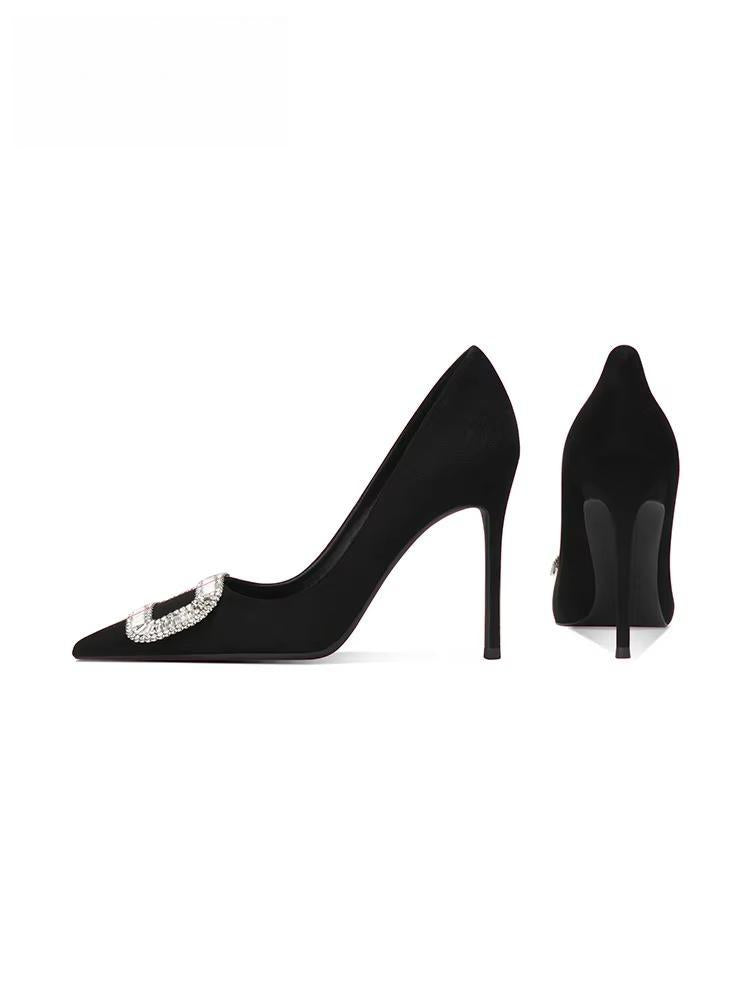 Black high-heeled shoes for women new model suede rhinestone square buckle temperament not tiring toe pointed single shoes