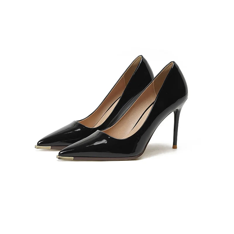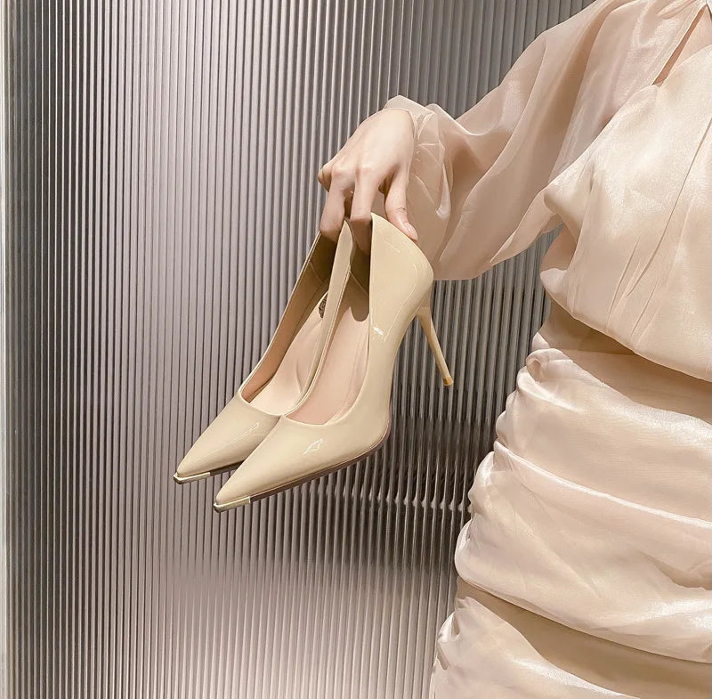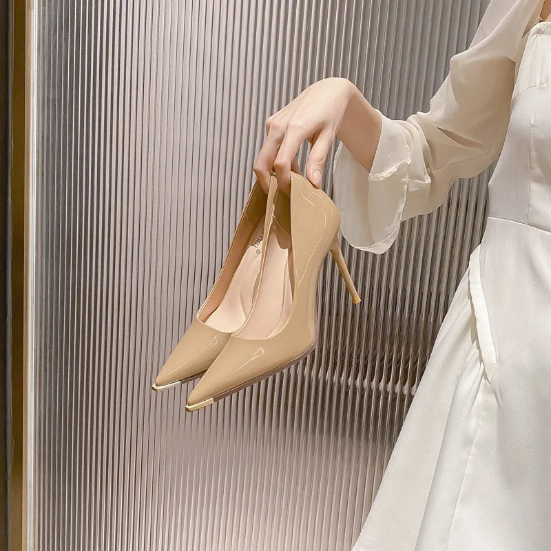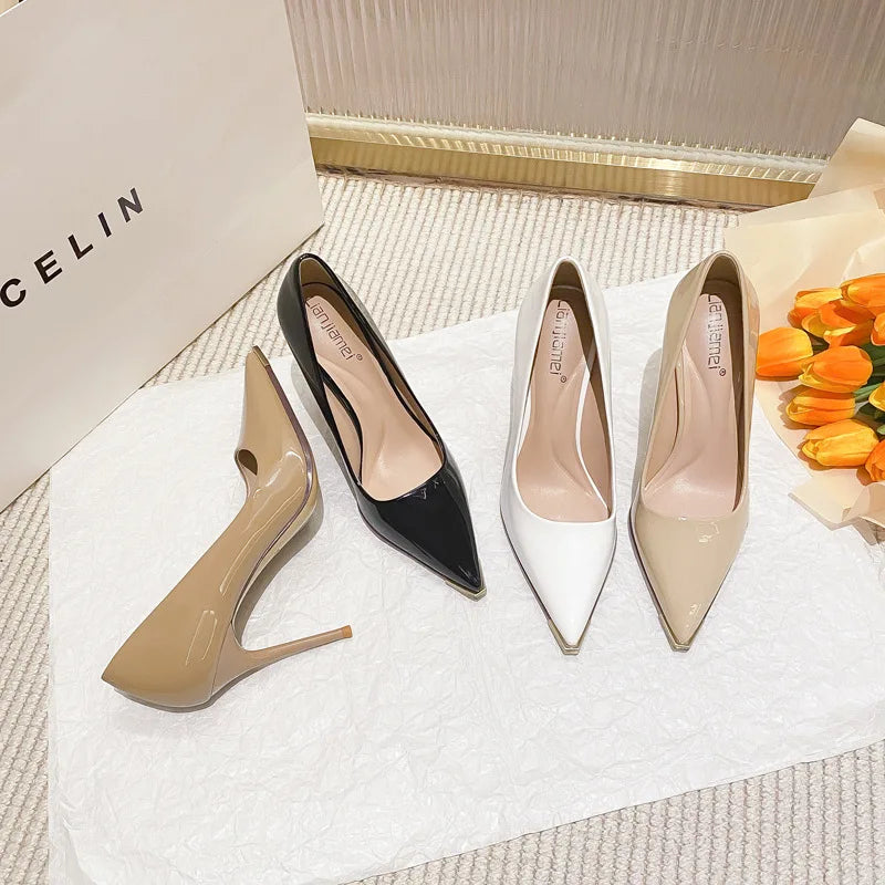 New nude high heels for women, slim heels, sexy pointed toe, patent leather waterproof platform, iron toe, white single shoes