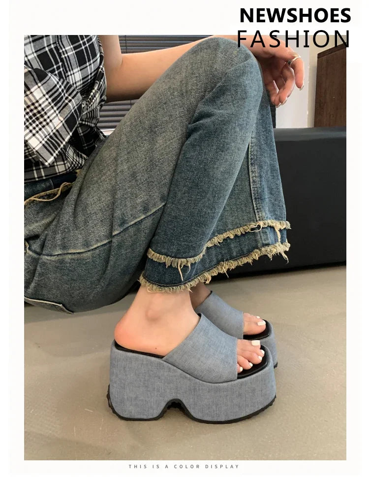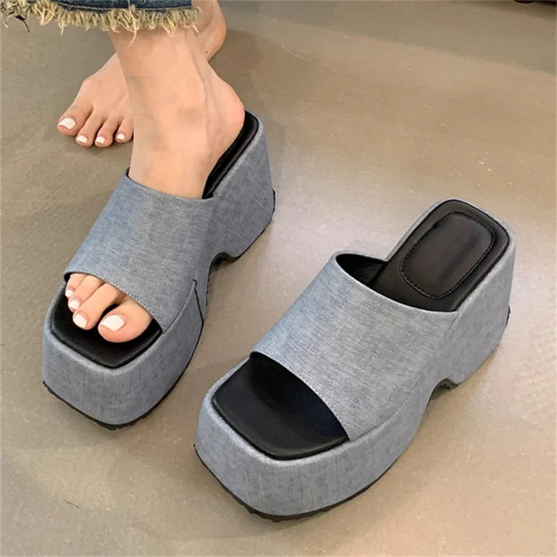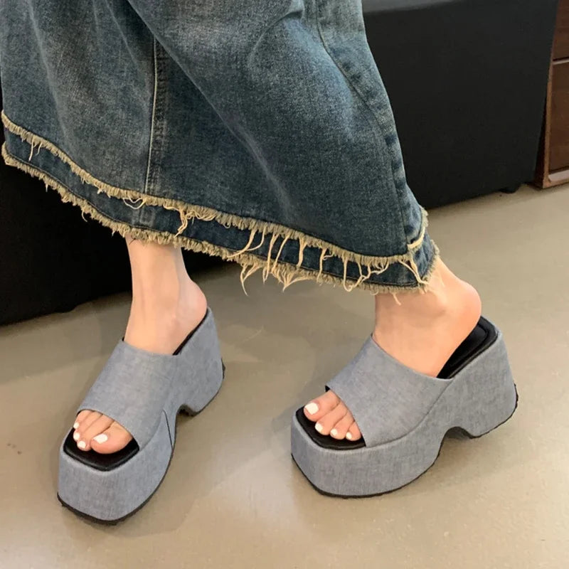 New Street Style Design Denim Square Toe Platform Wedges Women Slippers Chunky High Heels Roman Slide Ladies Shoes