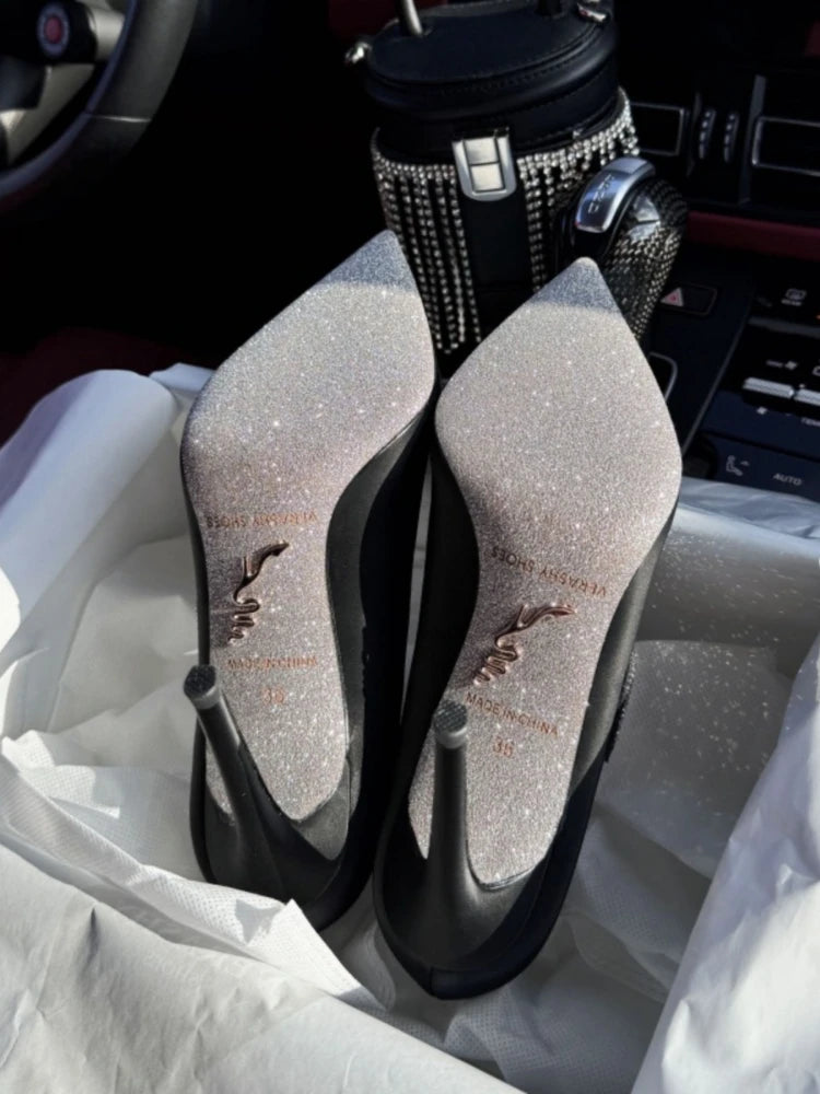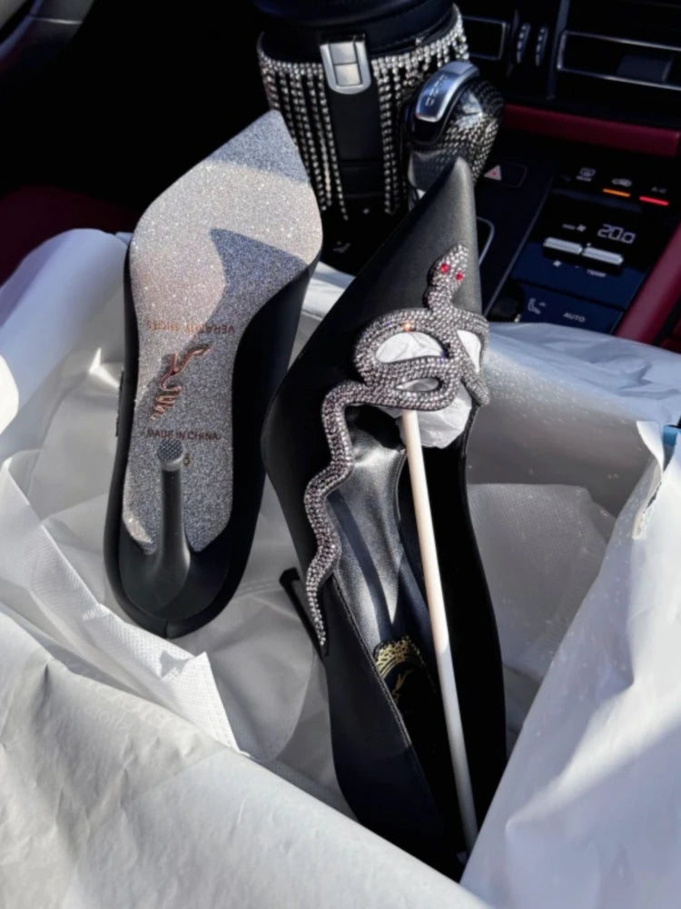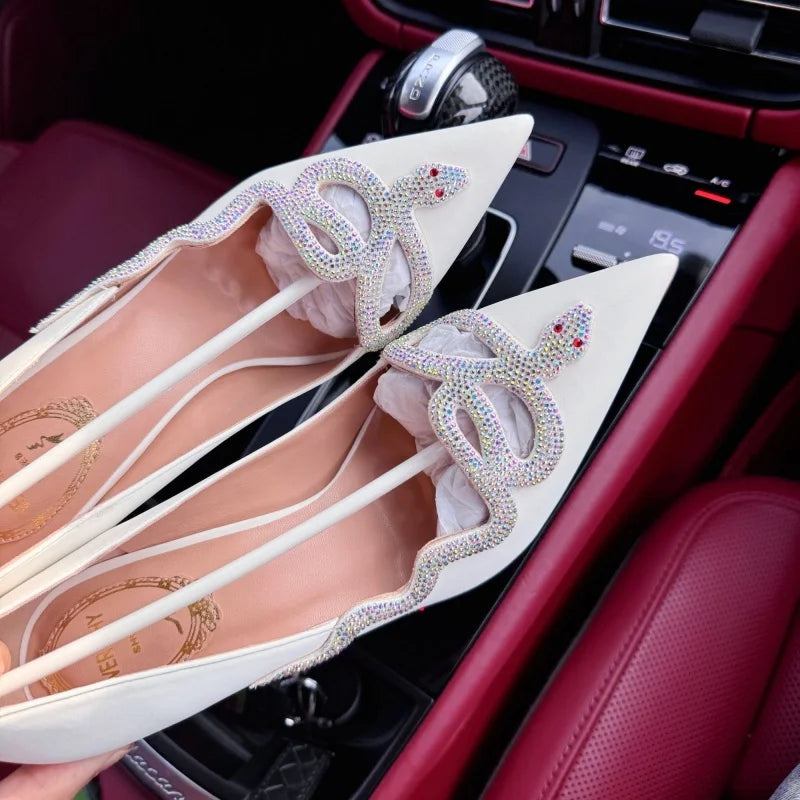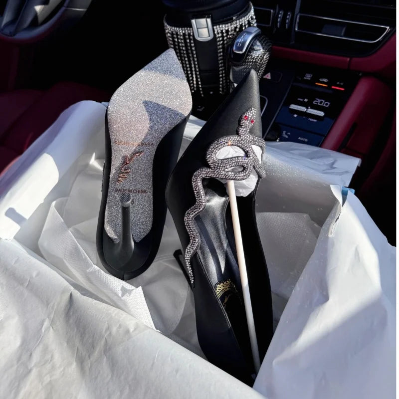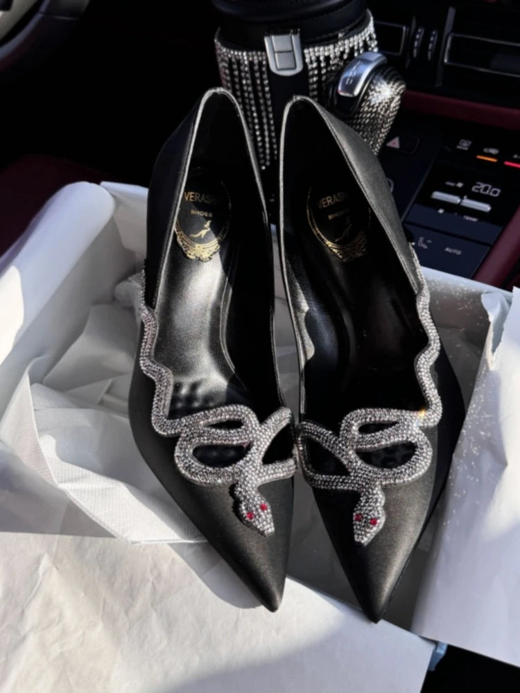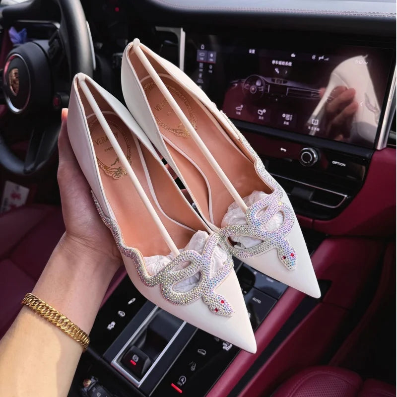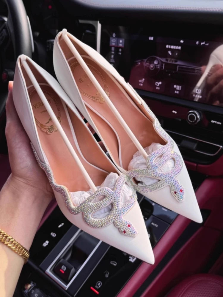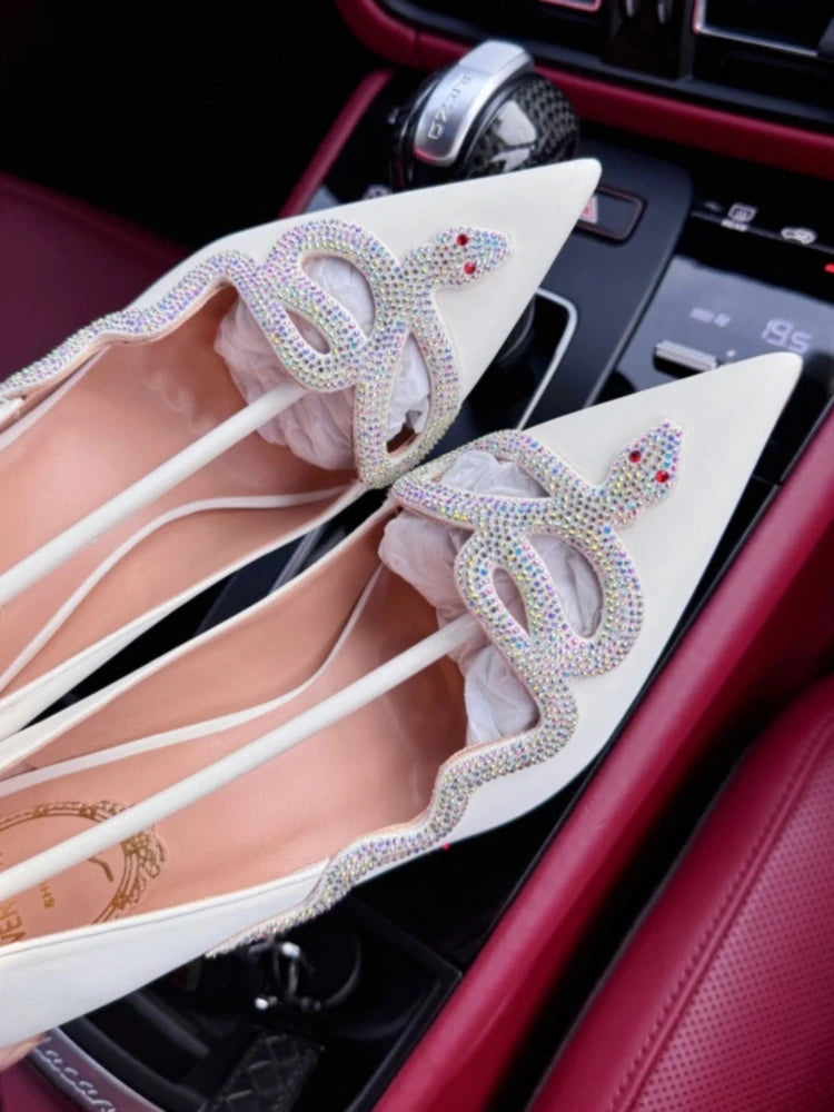 White high-heeled shoes for women new style French snake shaped black slim heel dress party sexy pointed single shoes
