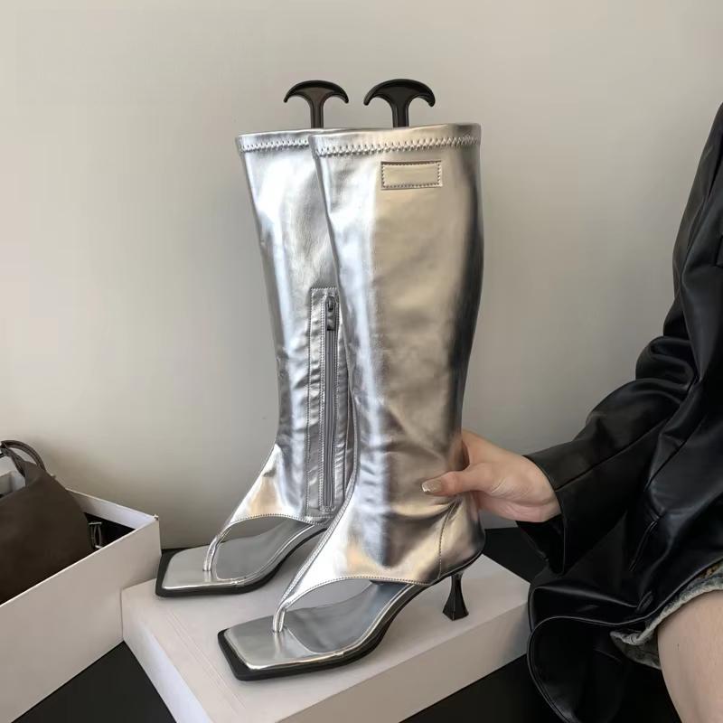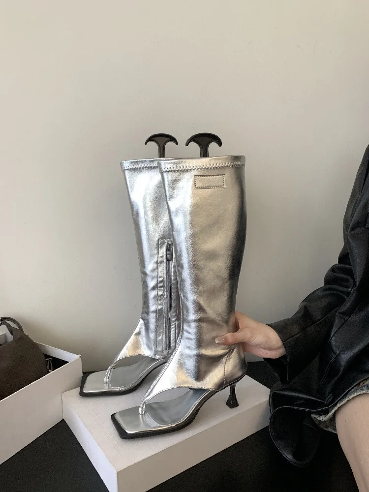 Open Toe Clip-On Women Knee High Boots Sock Booties Thin Low Heels Side Zipper Spring Party Pumps Sandals Shoes