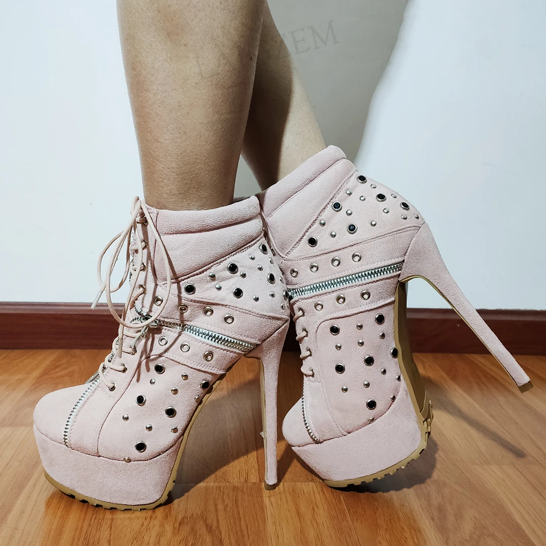 Women Ankle Platform Boots Studded Slim High Heels Boots Lace Up Faux Suede Autmn Winter Shoes Woman Large Size 38 44 47