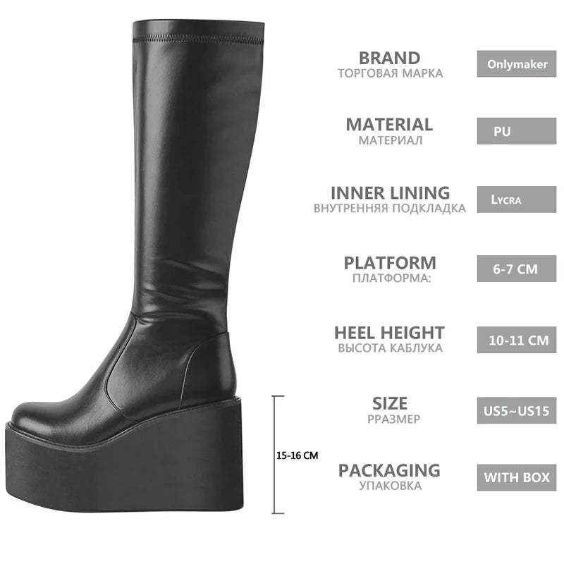 Women Platform Round Toe Wedges Boots Matte Black Knee High Zipper Big Size Fashion Boots