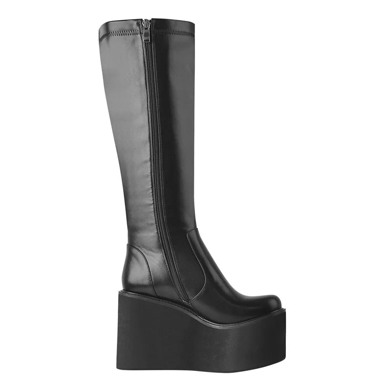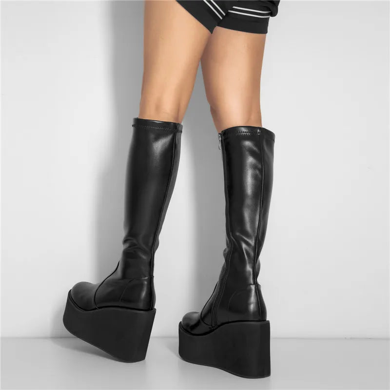 Platform Round Toe Wedges Boots Matte Black Knee High Zipper Big Size Fashion Boots