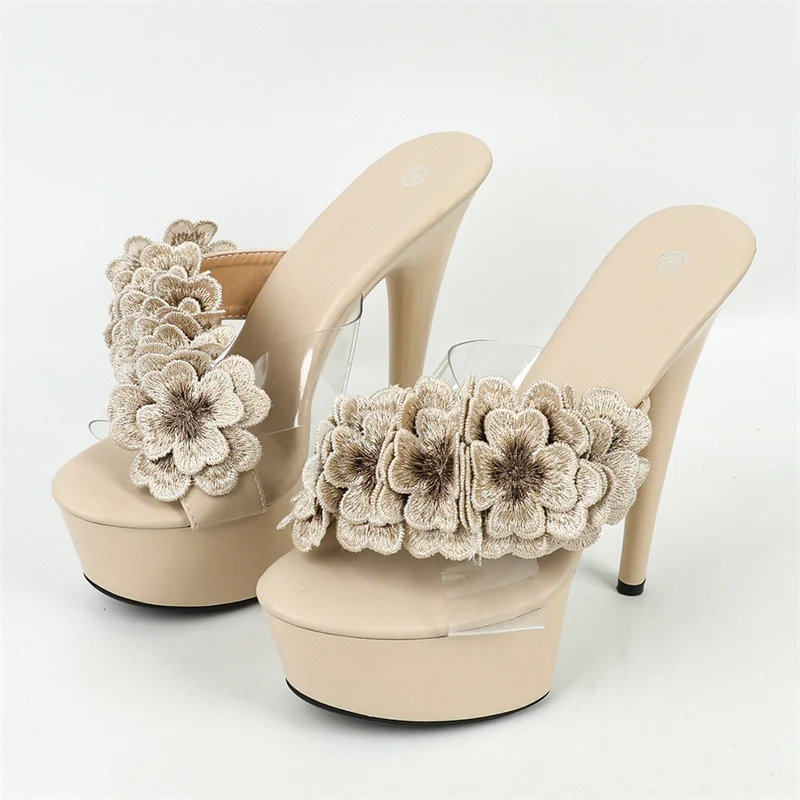 Platform Slipper For Women Fashion Embroidery Flower Open Toe Super High Heels