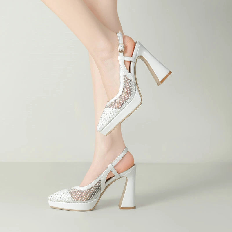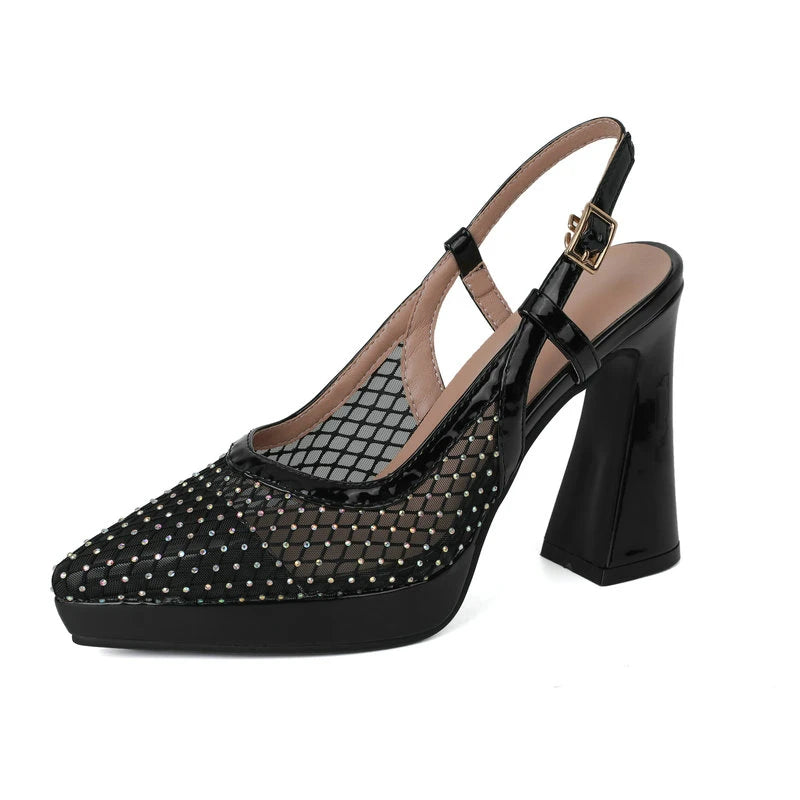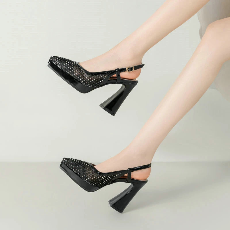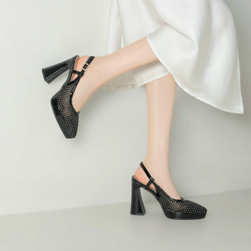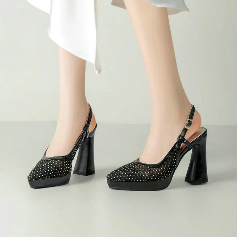 Summer Women High Heel Shoes Platform Square High Heel Ladies Pumps PU Leather High Quality Pointed Toe Women Shoes Black