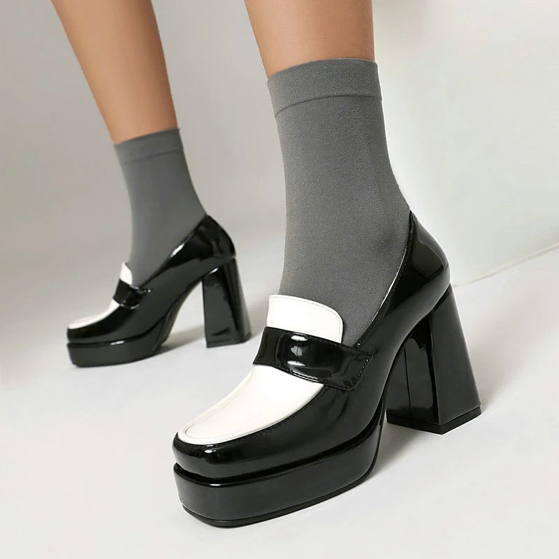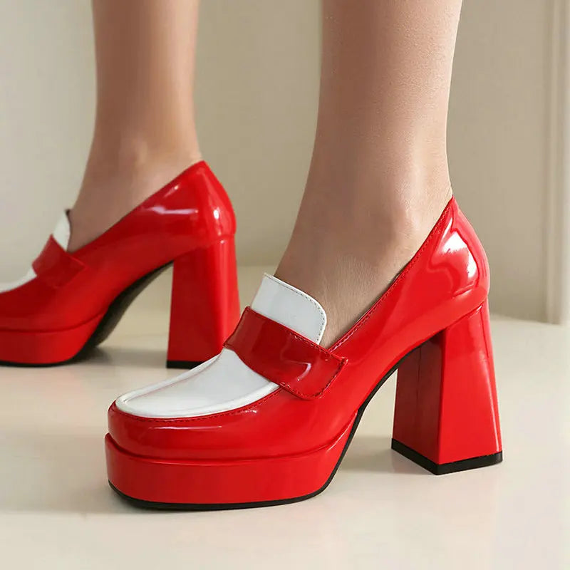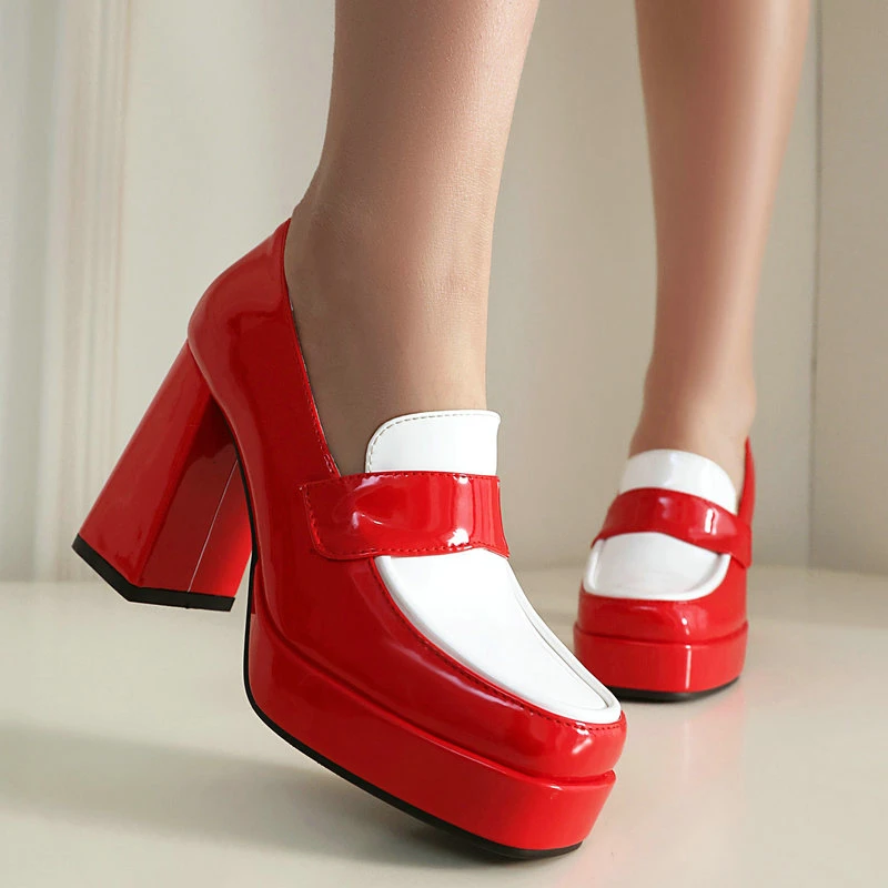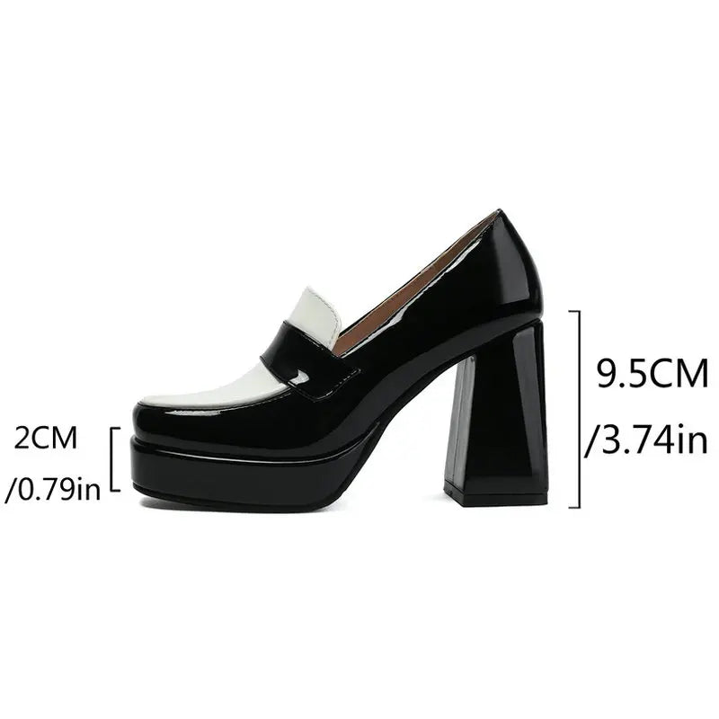 Spring Women High Heel Shoes Platform Thick High Heel Ladies Pumps PU Leather Square Toe Slip on Women Lazy Shoes Big Size