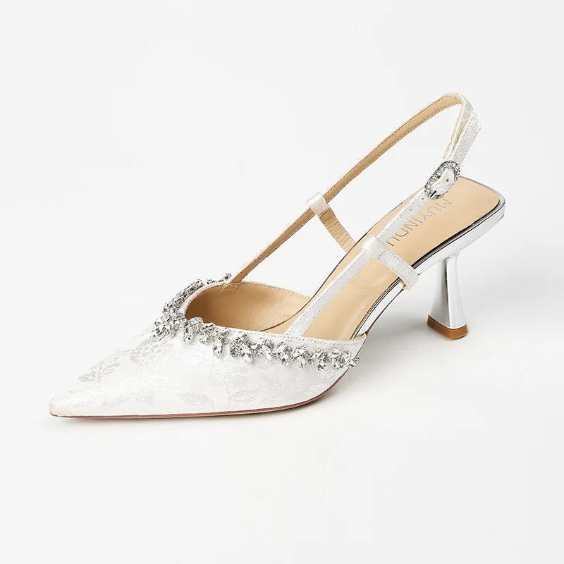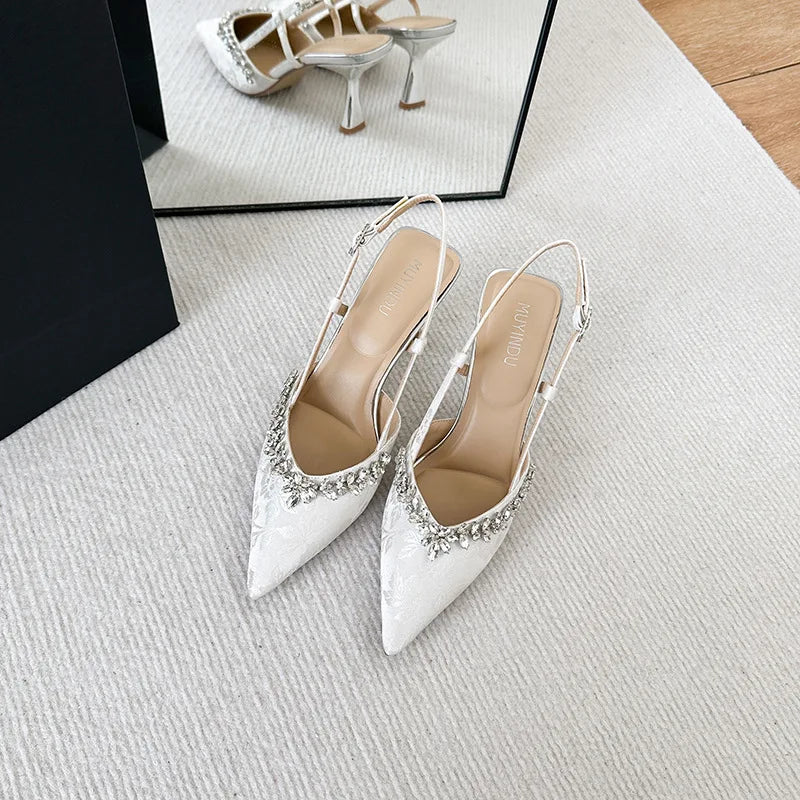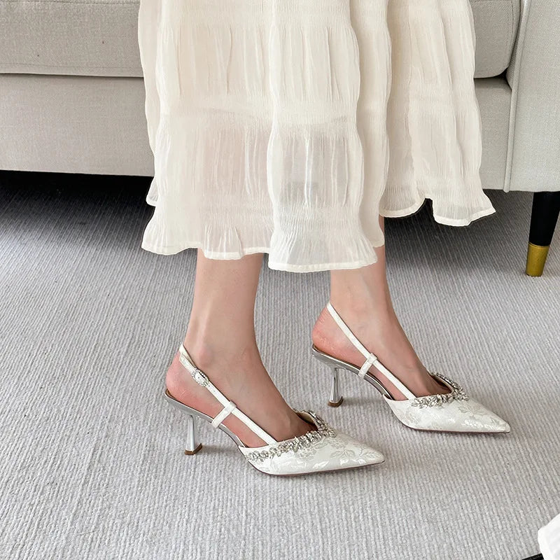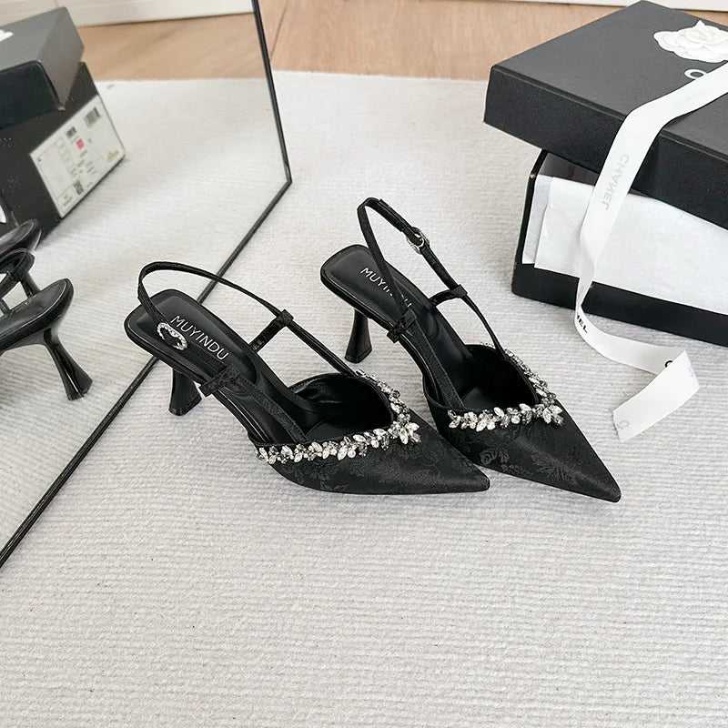 New High Heels for Women with Thin Heels, Pointed Chain, Water Diamond Style, Single Shoe, One Word Belt, Baotou, Banquet Shoes