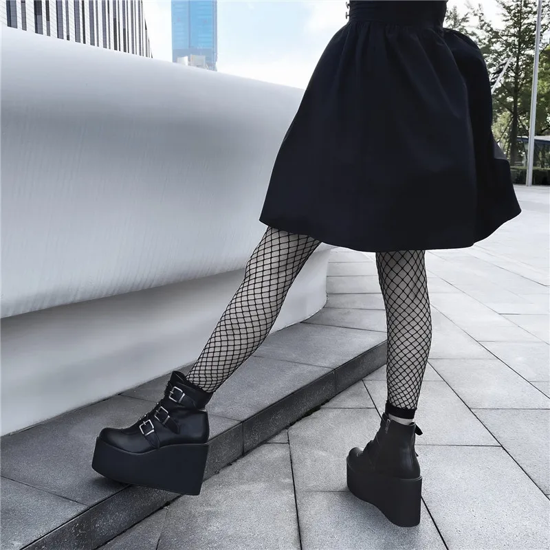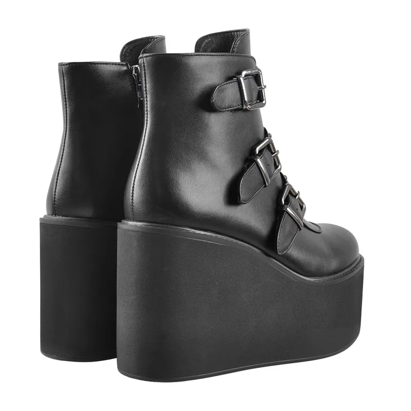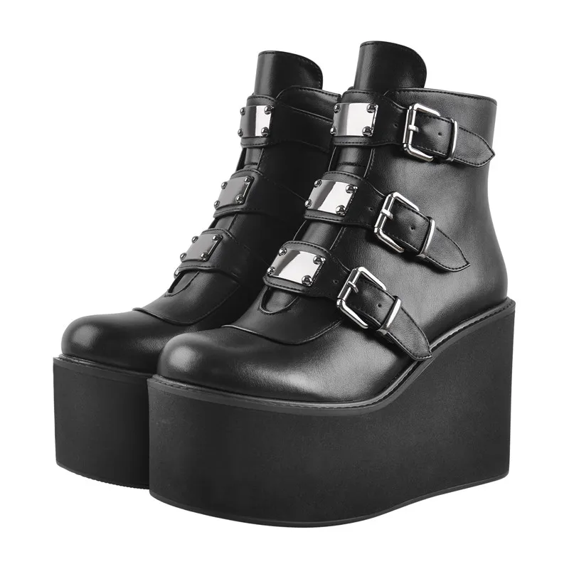 Punk Style Black Matte Ankle Boots Round Toe Buckle Decoration Zipper Fashion Platform Thick High Booties